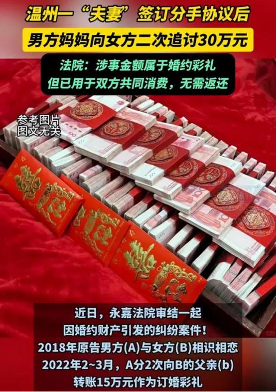 浙江温州,一女子收了男友的15万元彩礼以及30万元转账后,与男友举行了订婚仪式,且同居生活了3年多时间。谁知同居期间二人因感情不和分手,男友签下协议,约定只要求女子返还10万元彩礼,从此双方两清。可没想到,女子返还了10万元彩礼后,却被男友的母亲告上法院,要求追偿另外的30万元,还称这30万元是以结婚生育为条件的赠与,既然二人没结婚生孩子,那就应当返还。法院判了!   “钱还了,协议签了,为什么还要告我?”这句话,应该是小陈收到法院传票时,最想要问的。   2022年,小陈与男友的爱情修成正果,双方决定订婚。按照当地习俗,男友家给出了15万元彩礼。不久后,男友的母亲又向小陈转账30万元。随后,订婚、结婚的喜宴都办了,小两口也开始了同居生活。一切看起来都在沿着“结婚生子”的传统剧本顺利推进。   然而,三年多的同居时光里,爱情的滤镜逐渐破碎,柴米油盐的琐碎,性格上的本质差异,最终让两人选择了分手。值得一提的是,分手时,男友是理智的,或者说,是愿意承担后果的。他与小陈白纸黑字签下协议,核心意思很简单:小陈返还10万元彩礼,从此双方“两清”,江湖不再见。   小陈照做了,想要解脱的她,支付了这10万元,以为这段关系终于画上了一个句号,尽管不怎么完美。   就在小陈以为这件事已经翻篇之时,她却等来了一张法院的传票,曾经的“准婆婆”要求:那30万,必须还!因为这钱是以“结婚生育”为前提的赠与,如今婚没结,孩子没生,这笔“投资”自然失败了,理应撤回。   站在一位母亲的角度,这番逻辑似乎不无道理。她付出的,不仅是钱,更是对儿子未来家庭幸福的期盼。期盼落空,寻求经济上的“补偿”或“止损”,成了她本能的选择。然而,她选择性地忽略了一个关键事实:她的儿子,已经代表他们这个家庭,与小陈达成了“了结一切”的协议。   更何况,她的儿子作为当时与小陈共同生活的当事人,完全有权代表自己处理与女友之间的经济纠纷。他自愿签署协议,同意以10万元了结全部争端,这是其真实意思的表示,协议当然合法有效。不能因为一方亲属事后反悔,就轻易推翻已经达成的和解。   因此,法院最终驳回了男方母亲的诉讼请求,小陈无需再归还那30万元。   在现代社会,尤其是处理复杂的情感财产纠纷时,白纸黑字的协议是其中的关键。如果双方自愿达成的和解可以因任何一方的后悔或第三方的不满而被轻易推翻,那么社会的基本信任将无从谈起。前男友签下协议的那一刻,就应当预见到其后果,并受其约束。   而且,三年的同居生活,不是一句“未登记结婚”就能完全抹杀的。彩礼、赠与在长时间的共同生活中被消耗,也是很自然的事情。法律必须考量钱财的实际去向与用途,这并非鼓励同居,而是实事求是地处理同居引发的财产问题。   最后,只能说,面对婚姻和恋爱,大家都应该更理性、更负责地去开始、经营,甚至结束一段亲密关系。毕竟,好聚好散从来都不是说说而已。   信源: 环球网2025-10-17 ——浙江女子与未婚夫同居3年,分手后返还10万彩礼,却被准婆婆追讨30万!法院判了   文│一阳 编辑│史叔