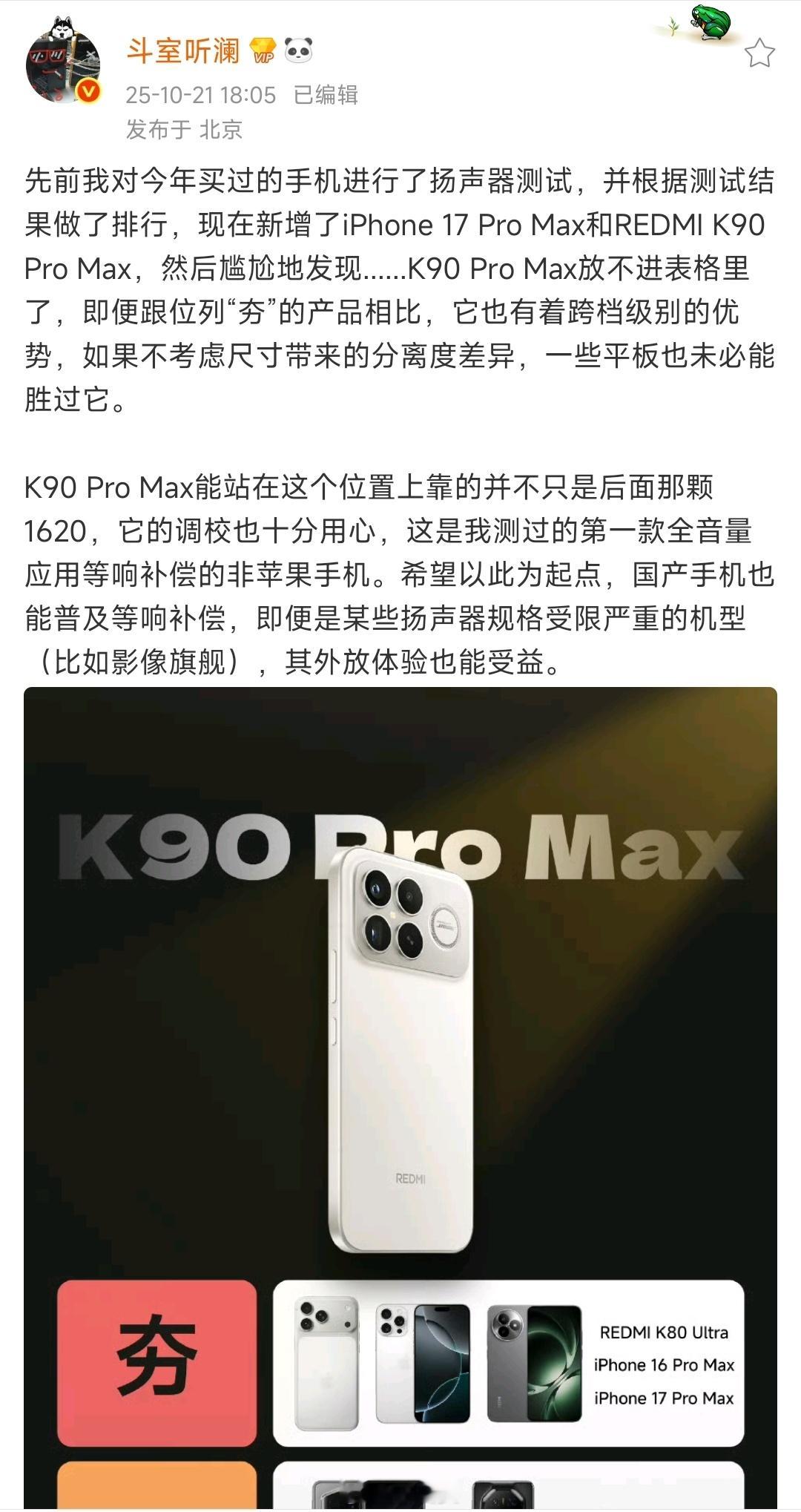 REDMI K90 Pro Max的扬声器水平,是要完胜小米17 Pro Max了吧,毕竟小米15 Ultra那么拉。