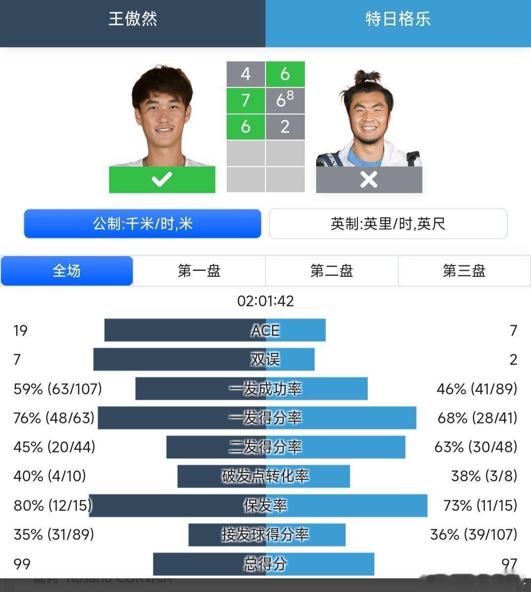 王傲然🇨🇳4-6/7-6(8)/6-2逆转战胜特日格乐🇨🇳,晋级第二轮,恭喜王傲然!🎉🎉🎉 ​​​