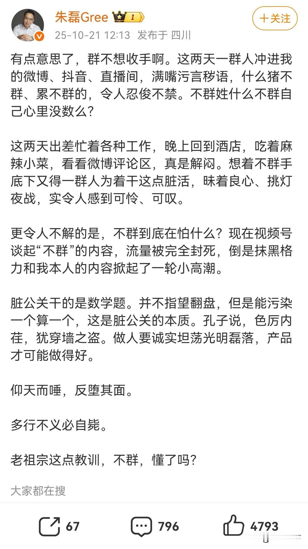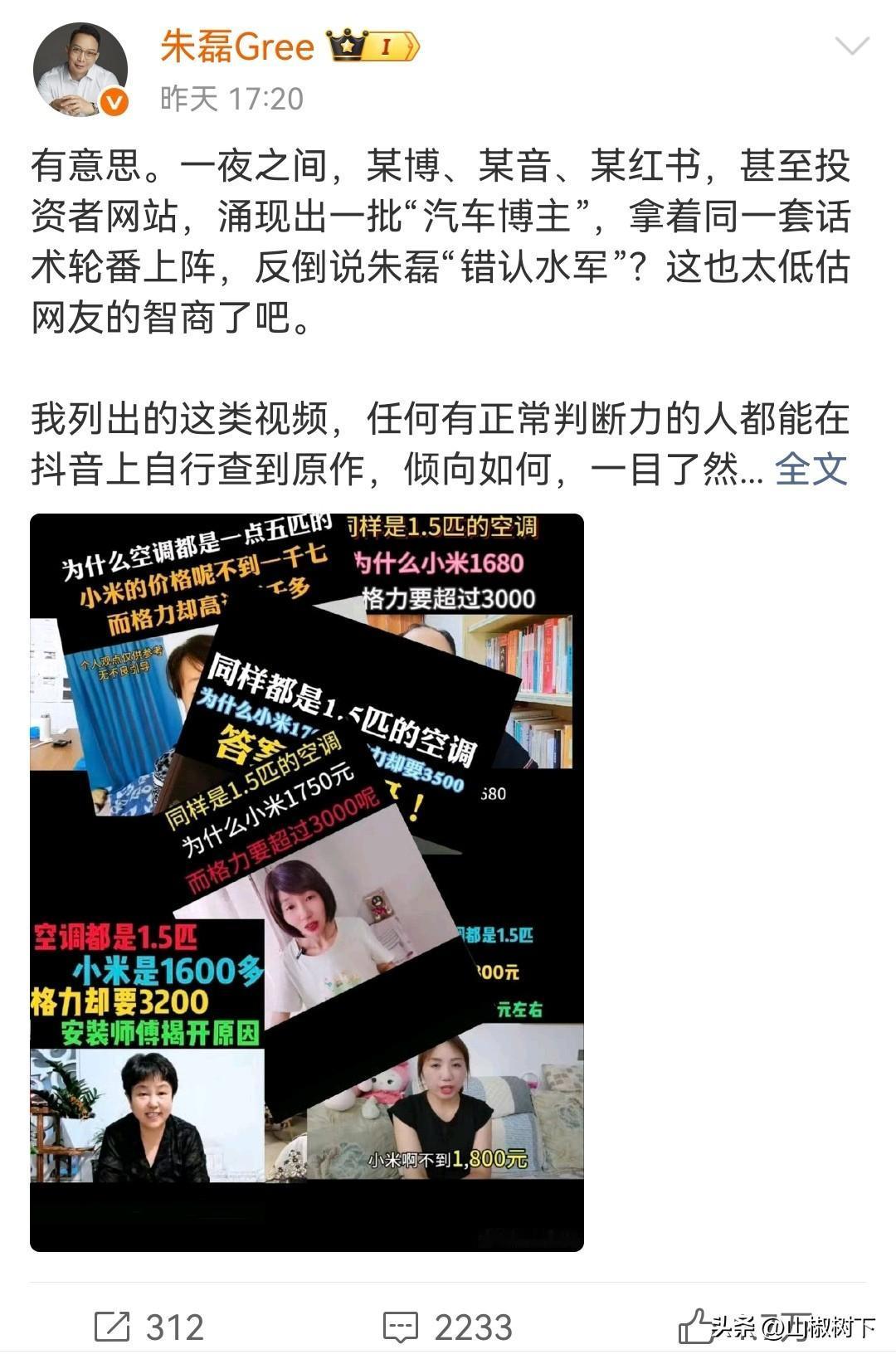 格力电器市场总监朱磊又开炮了,这回是彻底杠上了,他说谁抹黑格力,谁就是不群,还说这两天一直有人冲进他的微博、抖音、直播间,满嘴污言秽语,不要觉得自己那点脏公关的活干得很高明,逃得过法,也逃不过天。 有意思的是很多网友说朱磊认错水军,说视频里别人都是在夸格力,笑死我了,这场口水仗估计还有得打,朱磊说他掌握的材料很丰富,会慢慢分享给大家,坐等吃瓜[笑哭][笑哭]