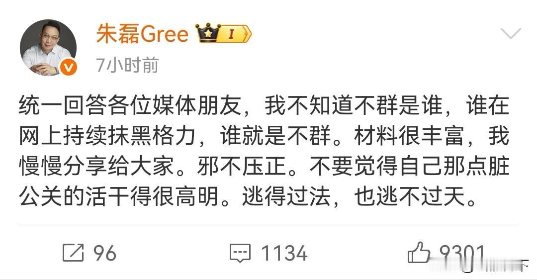 格力电器市场总监朱磊又开炮了,这回是彻底杠上了,他说谁抹黑格力,谁就是不群,还说