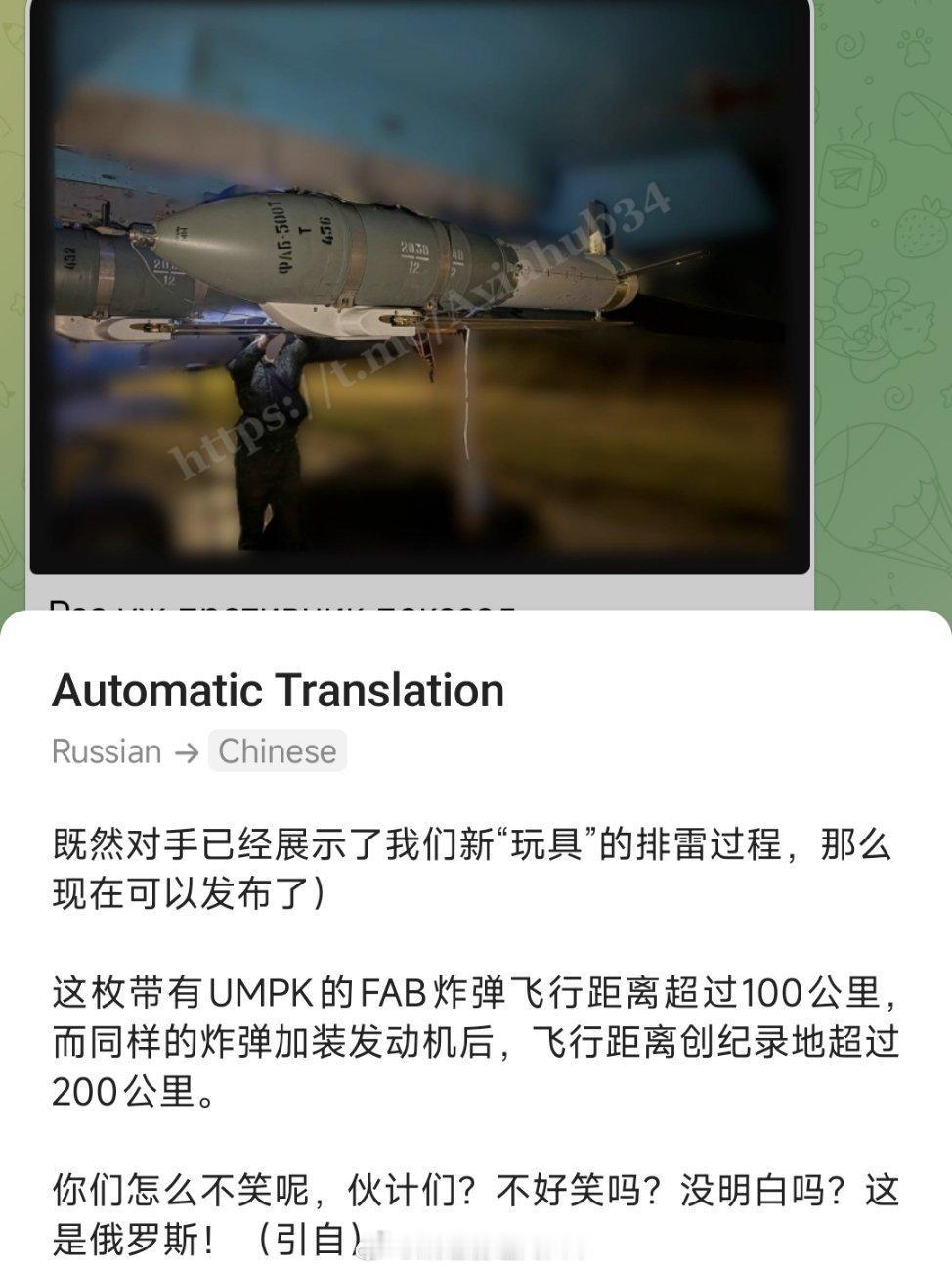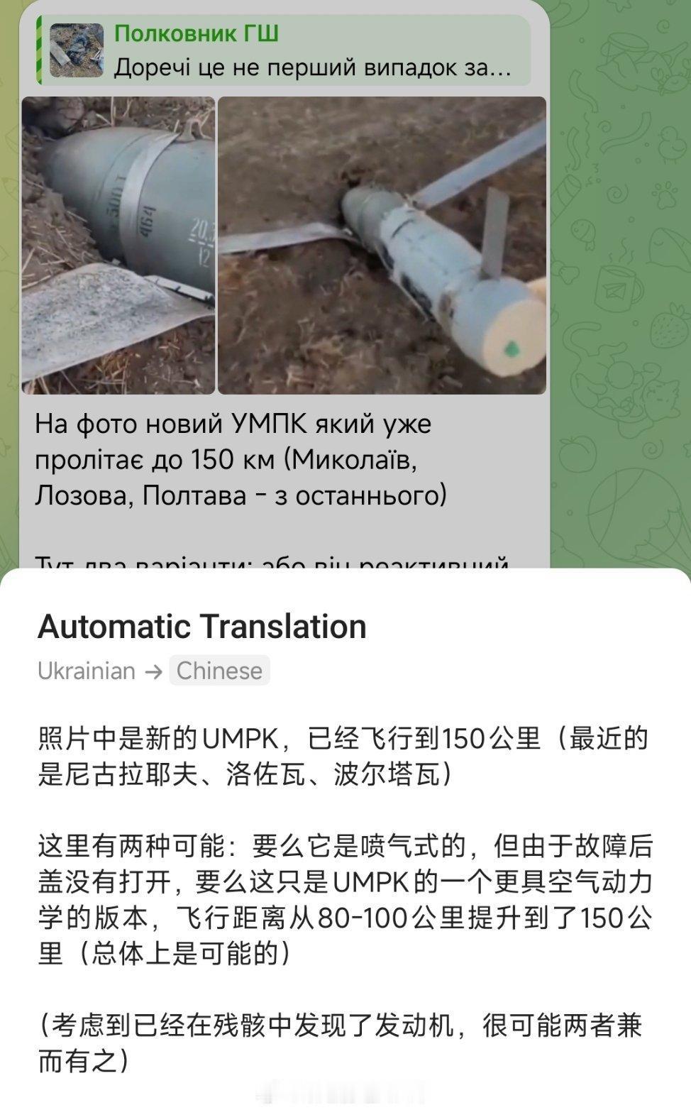 关于俄罗斯新的UMPK炸弹,有说法认为是无动力的,也有的说法认为这个未爆弹是动力未正常启动的状态 Aviahub说同样的炸弹装了“发动机”后射程超过200公里,乌克兰人说目前最远的投掷距离记录是193公里。个人猜测:该弹弹体后部加装的舱段没有看到进气口,尾部没有看到喷口,但明确能丢100多公里,应该是有助推动力的,无动力的扔不了这么远。结合Aviahub的爆料,猜测这个可能是火箭助推增程的,射程在150公里以下,未爆弹残骸的助推装置未正常启动,尾盖未抛弃;使用小型涡喷发动机的版本射程200公里,但当然也比较贵,小火箭还是比至少几万人民币的进口发动机便宜的。乌克兰工兵直接把这个UMPK未爆弹炸了,导致没有详细的拆解图流出,估计过一段时间就会有更多未爆弹残骸,肯定会有拆解的,具体啥样到时候就知道了。