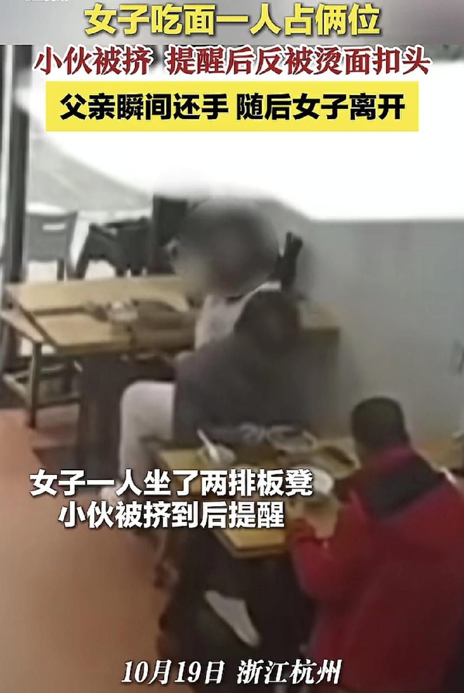 10月19日,浙江杭州,一家面馆里一名女子坐着两排座椅的位置,后面的小伙子感觉到被挤之后提醒了女子,女子非但没有注意,反而是激怒了他,用烫面就往小伙子头上扣,正好坐在对面的父亲看到了赶紧就把女子抓住,最后你儿子还返回来掉到地上的东西捡起来。跟着这种数字和情绪有问题的人在一块一定会觉得特别的压抑,同时提醒我们出门在外,一定要注意自己的人身安全,因为你不知道你所遇到的每一个人会是什么样的心理状况。