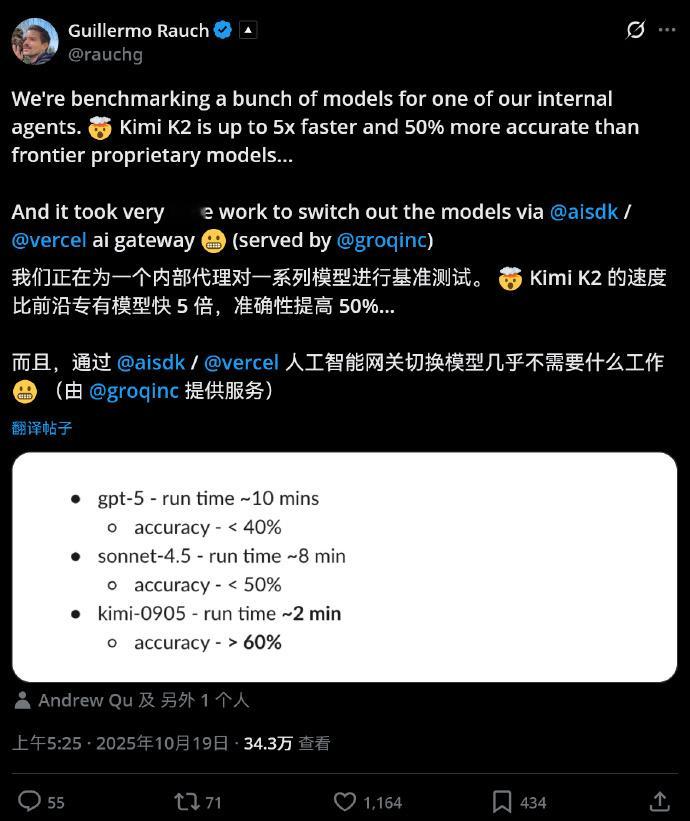今天刷到Vercel 创始人Rauch的推,说在他们的内部agent测试中,kimi k2比gpt-5和sonnet 4.5 还能打(图1):
