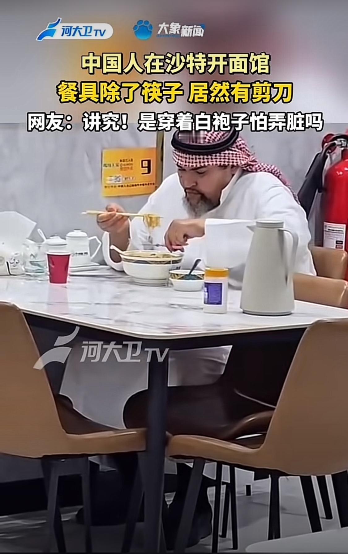 中国人在中东开面馆,除了提供筷子外,还要额外提供剪刀。没错,剪刀就是用来剪面条的,当地人先用筷子将面条高高挑起来,然后另一手拿剪刀将面条在合适位置剪断,之后再送到嘴巴。 大老爷们这样吃面条,矫情又滑稽。对我们来说,再长的面条,一吸溜就进嘴巴了,至于用剪刀这么麻烦吗。再说中国传统文化中,面条代表着长寿,是不能剪断的。 不过有人说,中东这些老外都留有大胡子,长面条吸溜时很容易沾到胡子,极不卫生。而他们又喜欢吃拉面,双方妥协之下,才想出了这个办法。 真是大千世界无奇不有!