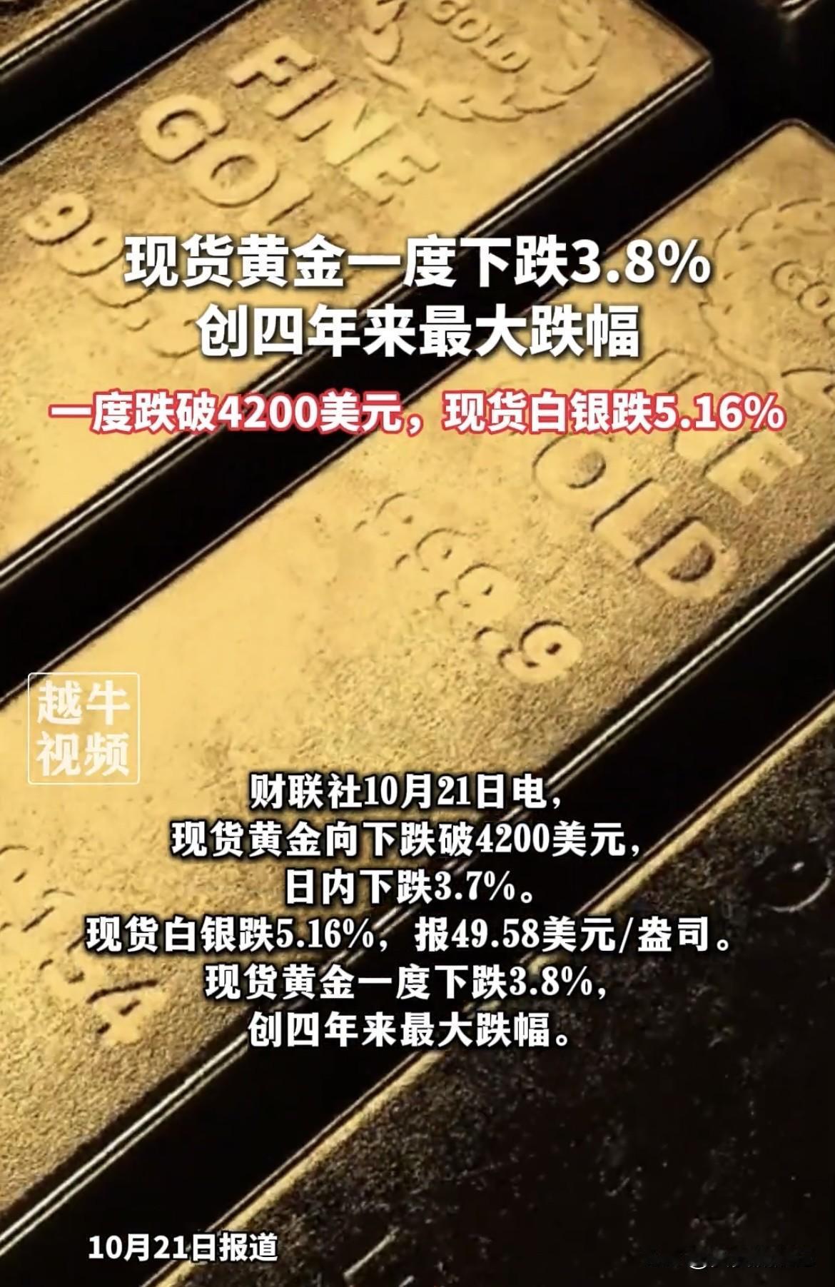 今天黄金和白银这俩“贵金属兄弟”可闹大动静了,现货黄金日内一度下跌3.8%,白银更是大跌5%,双双创四年最大跌幅,现货黄金还失守4200美元。 这突然大跌是有原因的。宏观上,贸易局势和地缘政治缓和、美元反弹、黄金上涨动力消退,再加上美国政府停摆可能结束,让贵金属市场出现调整和获利了结情绪。南华期货的夏莹莹说,周末国际贵金属价格冲高回落,市场风险偏好回升,多头获利了结。 近期金价大幅波动,光大银行都开始对黄金交易戴“紧箍咒”,调整合约保证金,解除无持仓客户业务委托关系,也是为保护投资者。短期交易冲击大,投资还得谨慎!