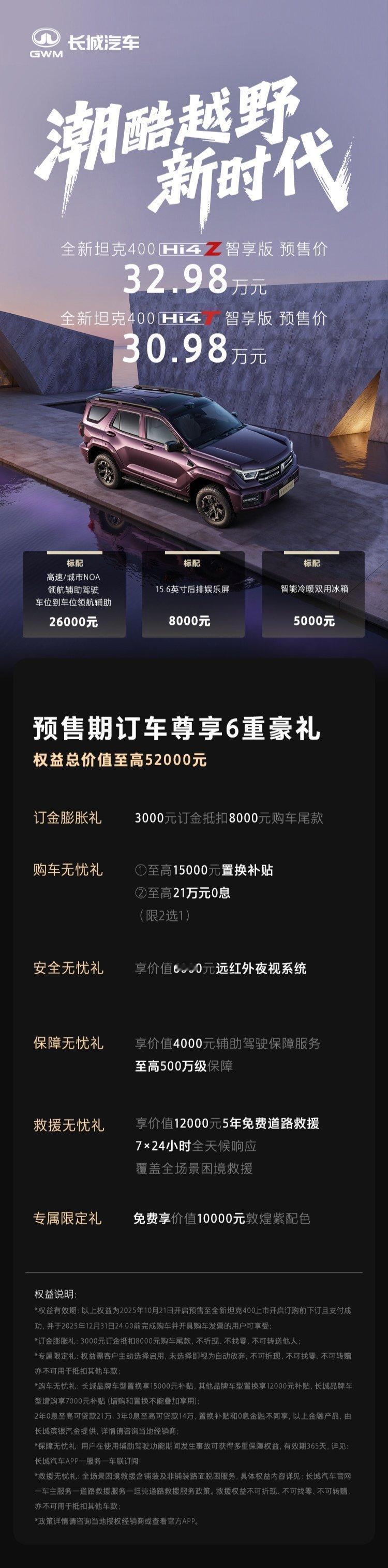 潮酷越野新时代全新坦克400今天正式开启预售,共有两个配置版本,分别为32.98万的Hi4-Z智享版和30.98万的Hi4-T智享版。现在预订3000元可抵扣8000元尾款,还有安全无忧礼、保障无忧礼等多项权益。这样一款潮酷越野车,大家喜欢吗?魏建军开启去爹味挑战全新坦克400正式预售 ​​​