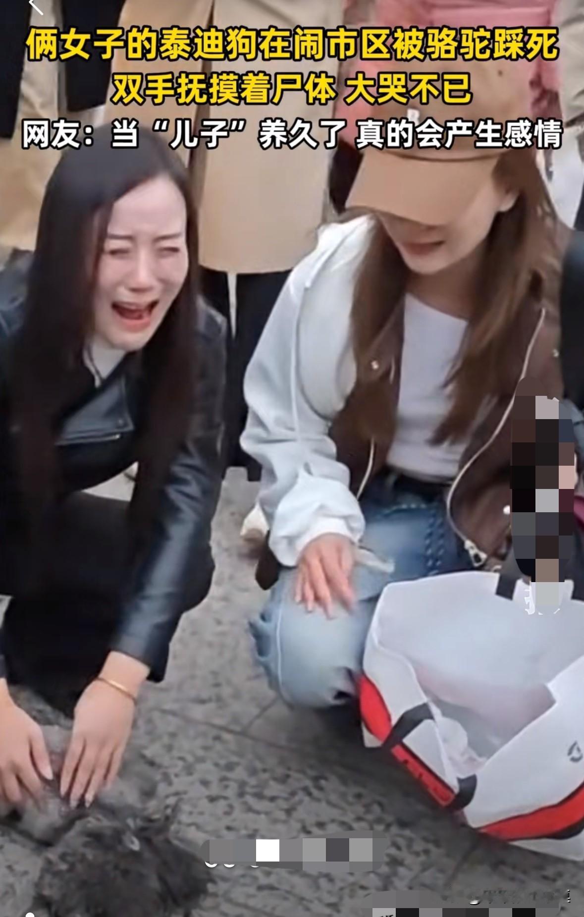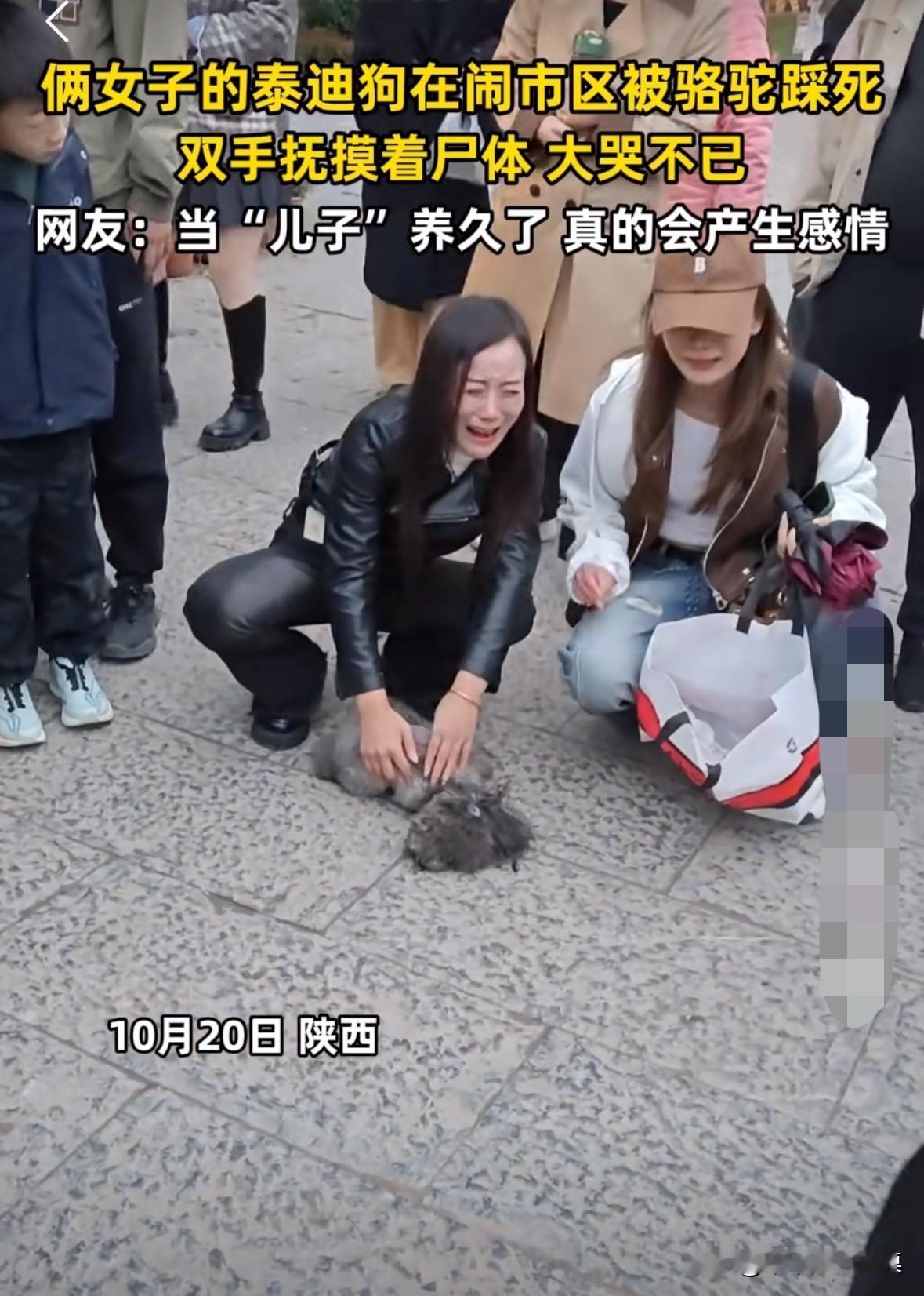 陕西两名女子带着自己养的泰迪逛街,由于在闹市,人太多,泰迪被骆驼给踩死了。 两女子赶紧蹲下查看,狗已经断气了,两个女子在街上嚎啕大哭,悲伤欲绝。 评论区:“有些养狗的,估计对自己父母都没有对狗好。” 还有人说:“当“儿子”养太久了,真的会产生感情。” 你们如果真的喜爱这条狗,在人多的地方就应该一直抱着不撒手,真是可怜白发人送黑发人了。