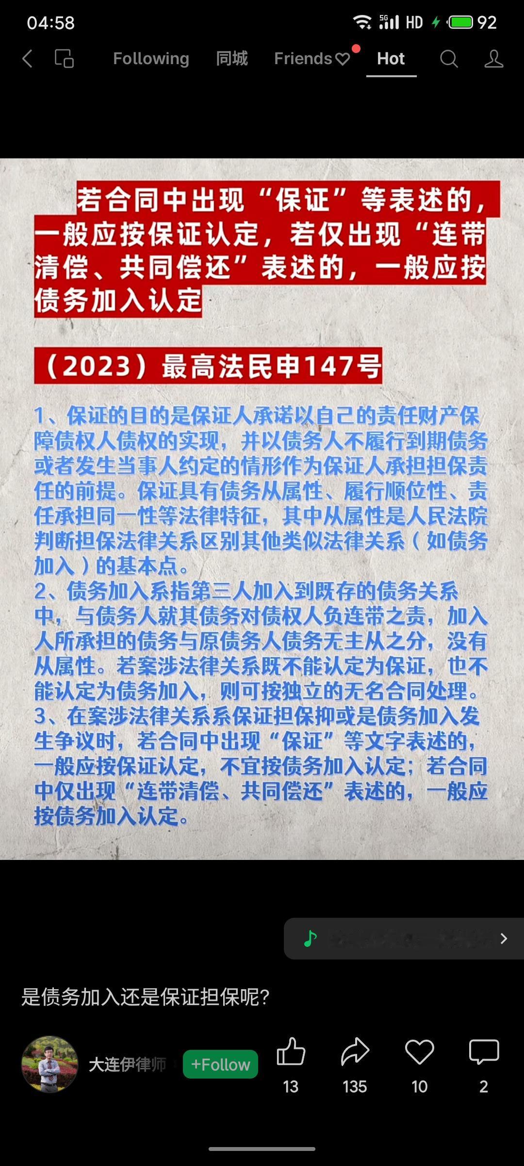 最高人民法院明确保证与债务加入的认定标准:合同出现"保证"表述的按保证认定,其具有债务从属性;仅出现"连带清偿、共同偿还"等表述的按债务加入认定,后者无主从之分。该界定为类似案件提供了裁判指引。