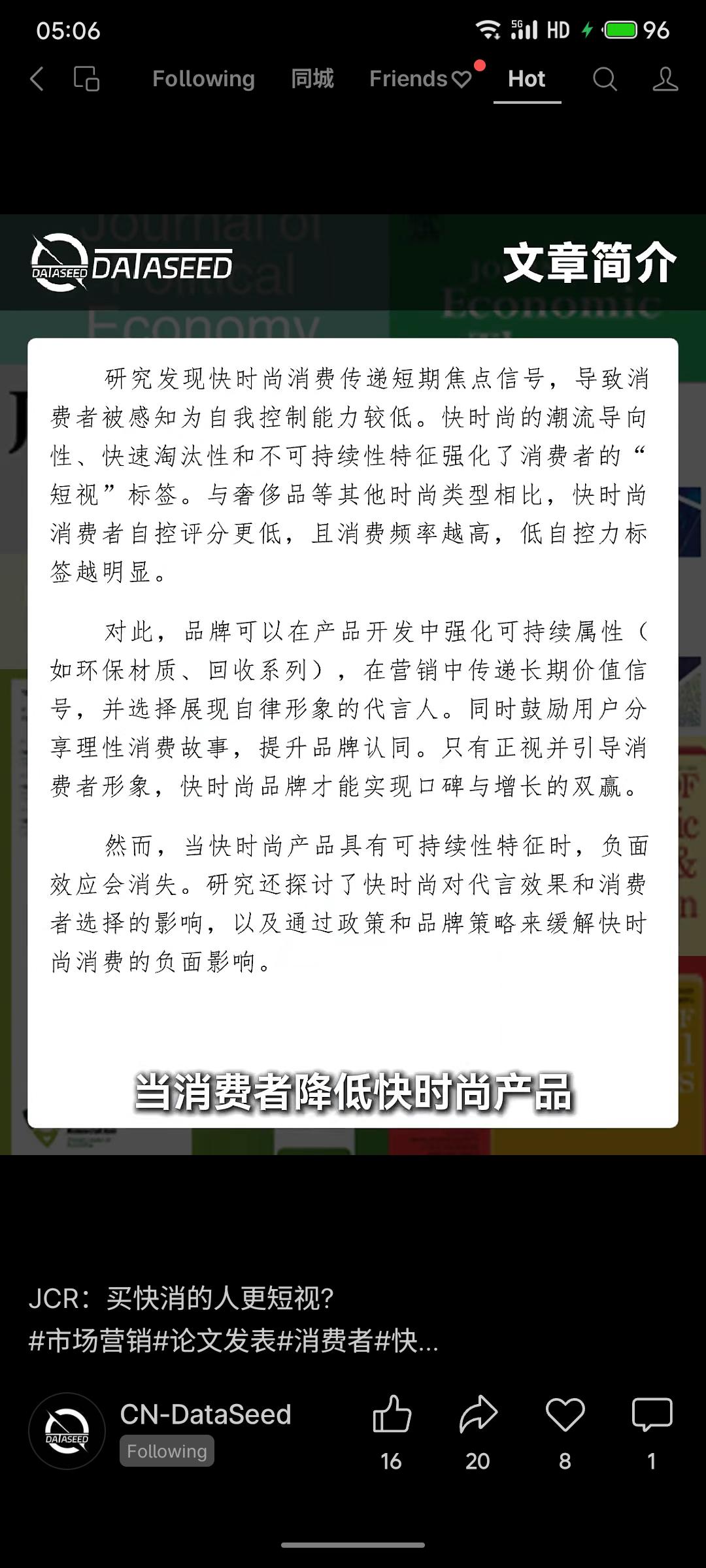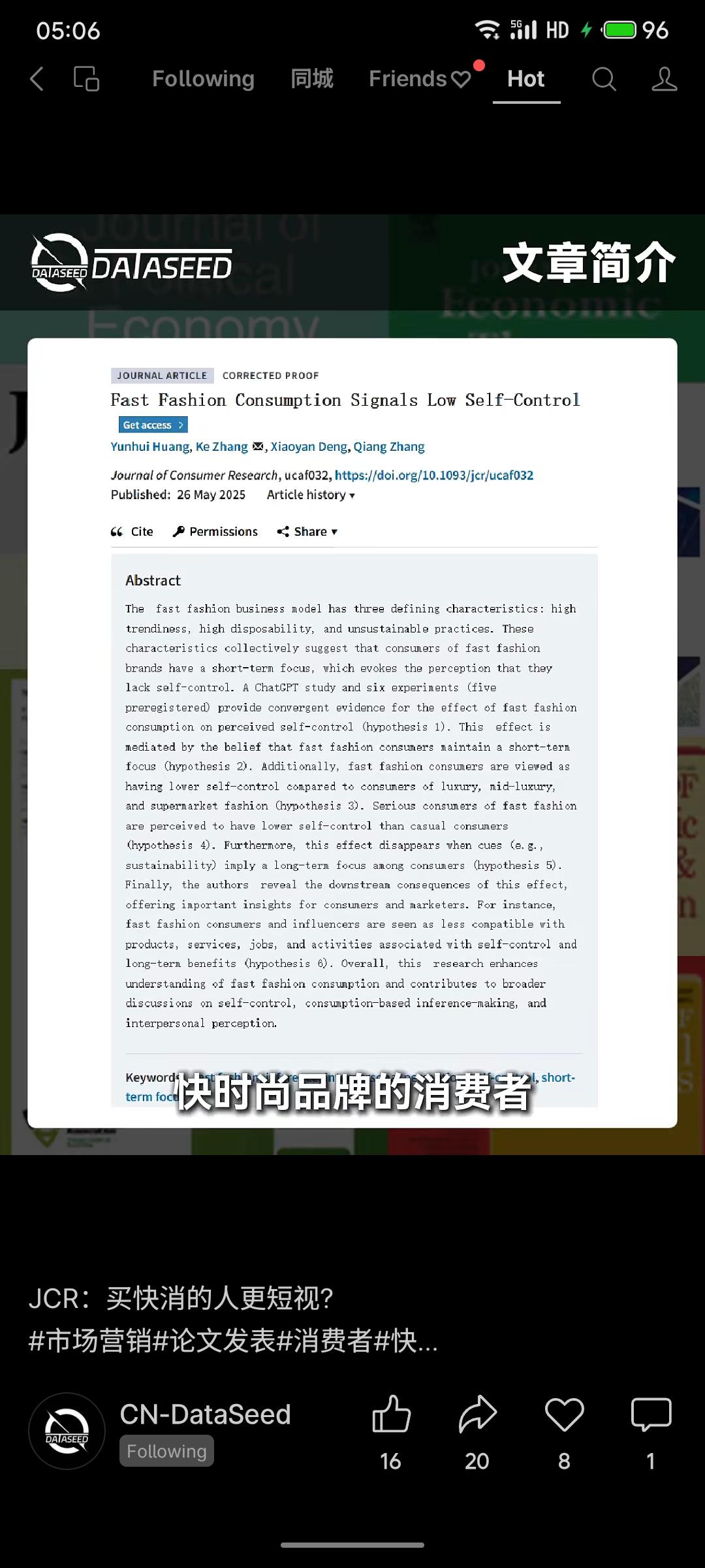 市场管理类顶刊《消费者研究杂志》最新一项研究指出,快时尚消费被视为低自控力信号。其高潮流性、快速淘汰性与不可持续性特征,使消费者被贴上“短视”标签。相较于奢侈品等其他品类,快时尚消费者自控评分更低,且负面印象随消费频率增加而加剧。研究同时发现,强化可持续属性可有效消除这种负面认知。