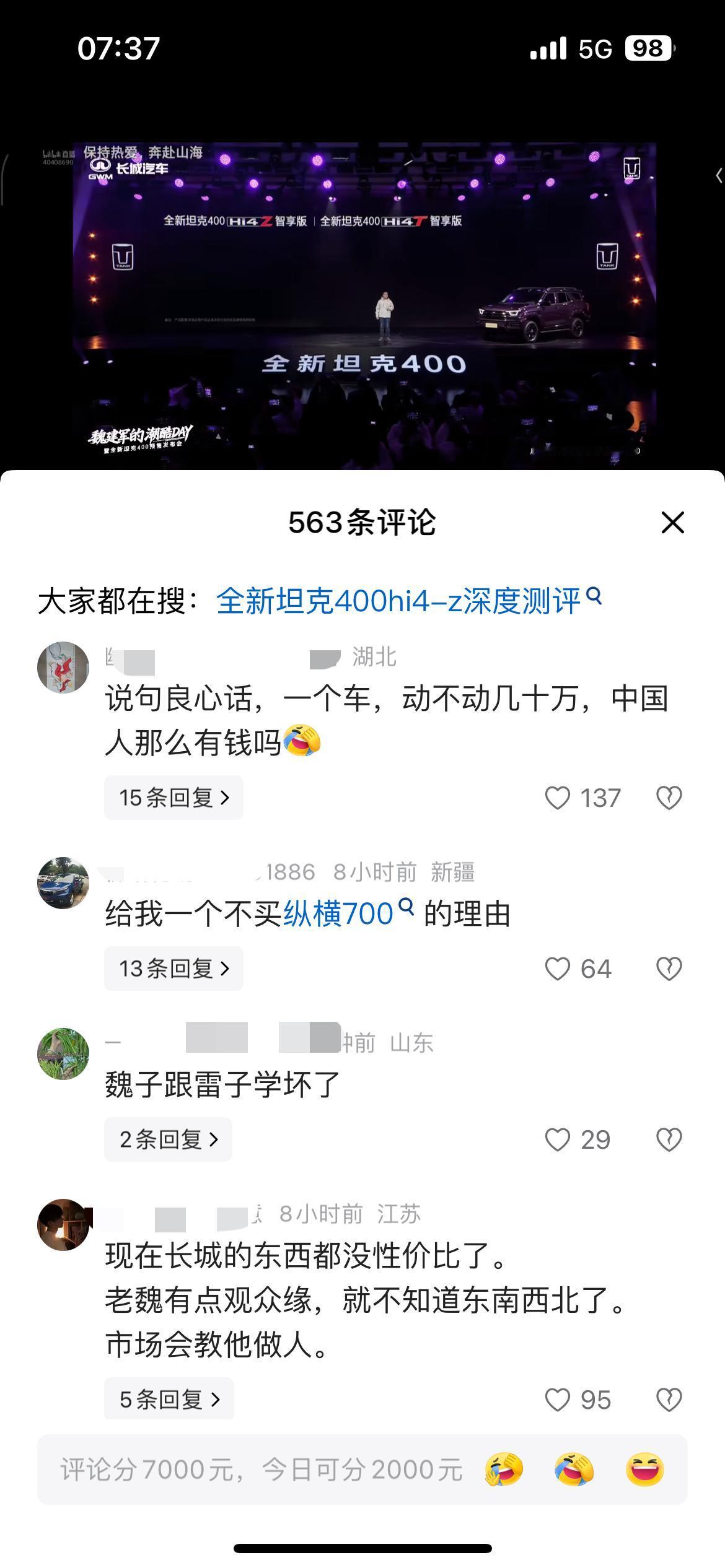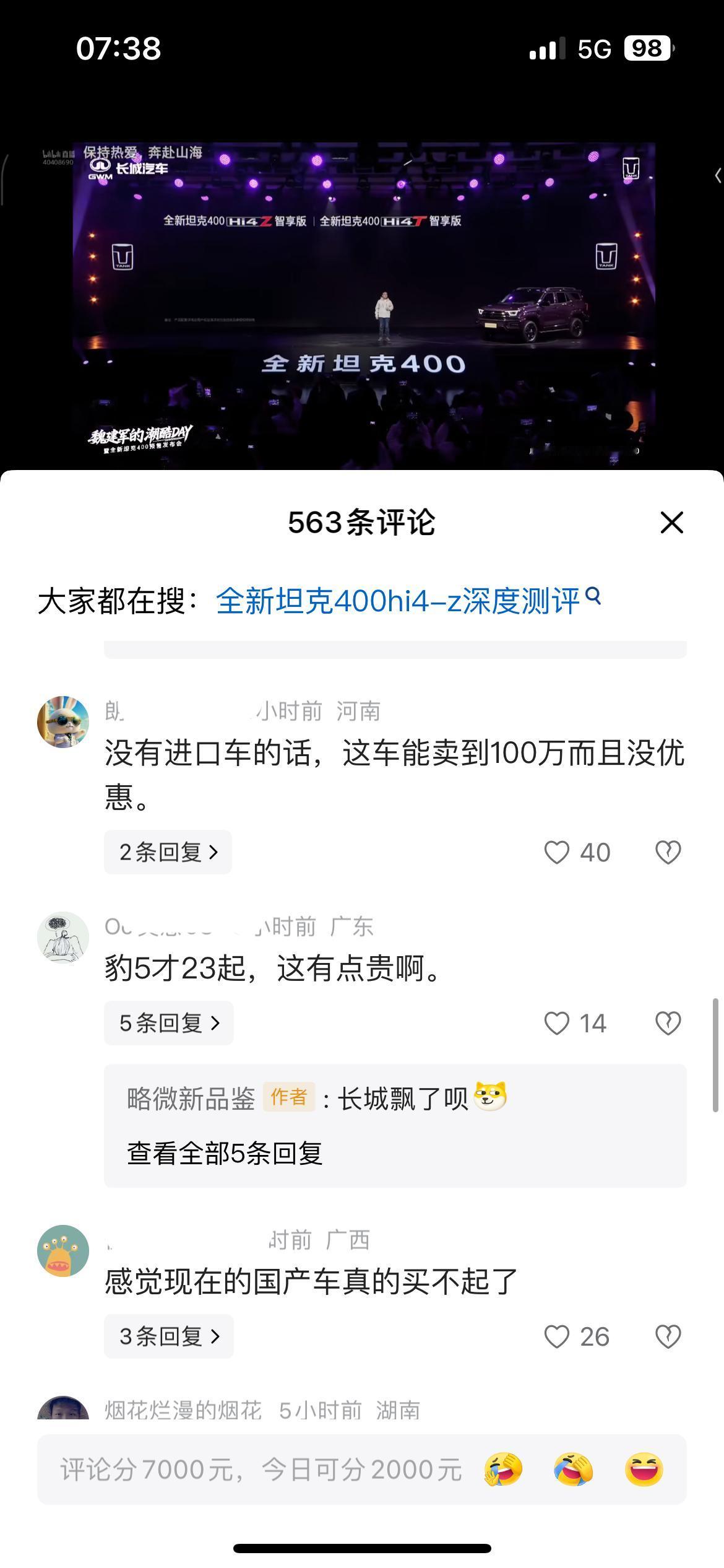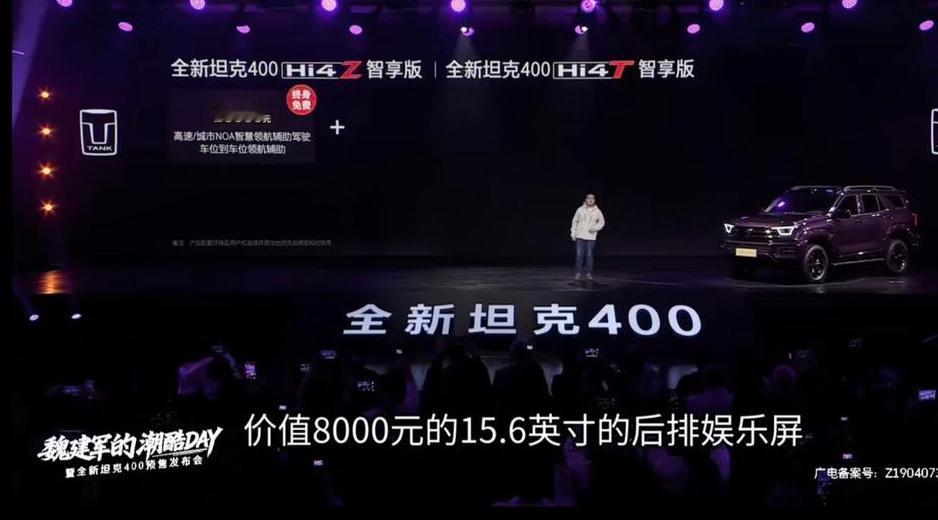 “要是没有进口车,这车能卖到100万还没优惠!” 全新坦克400一经发布,便遭网友疯狂调侃。 “价值5000元的车载冰箱[笑哭],我家双开门冰箱才3500元” “价值8000元的15.6寸后排娱乐屏” “魏子跟雷子学坏了” “如今长城车没性价比了” “国内这些企业,不支持它们吧,说你不爱国;支持它们吧,越支持价格越高!” “在车企里,长城的利润名列前茅” 以上都是网友评论,一是调侃长城的营销学雷军,二是觉得价格高得离谱。不过有热心网友给出如下建议: “豹5才23万起,这坦克400有点贵啊!” “给我一个不买纵横700的理由” “目前我只能买得起奥迪、奔驰、宝马了。”
