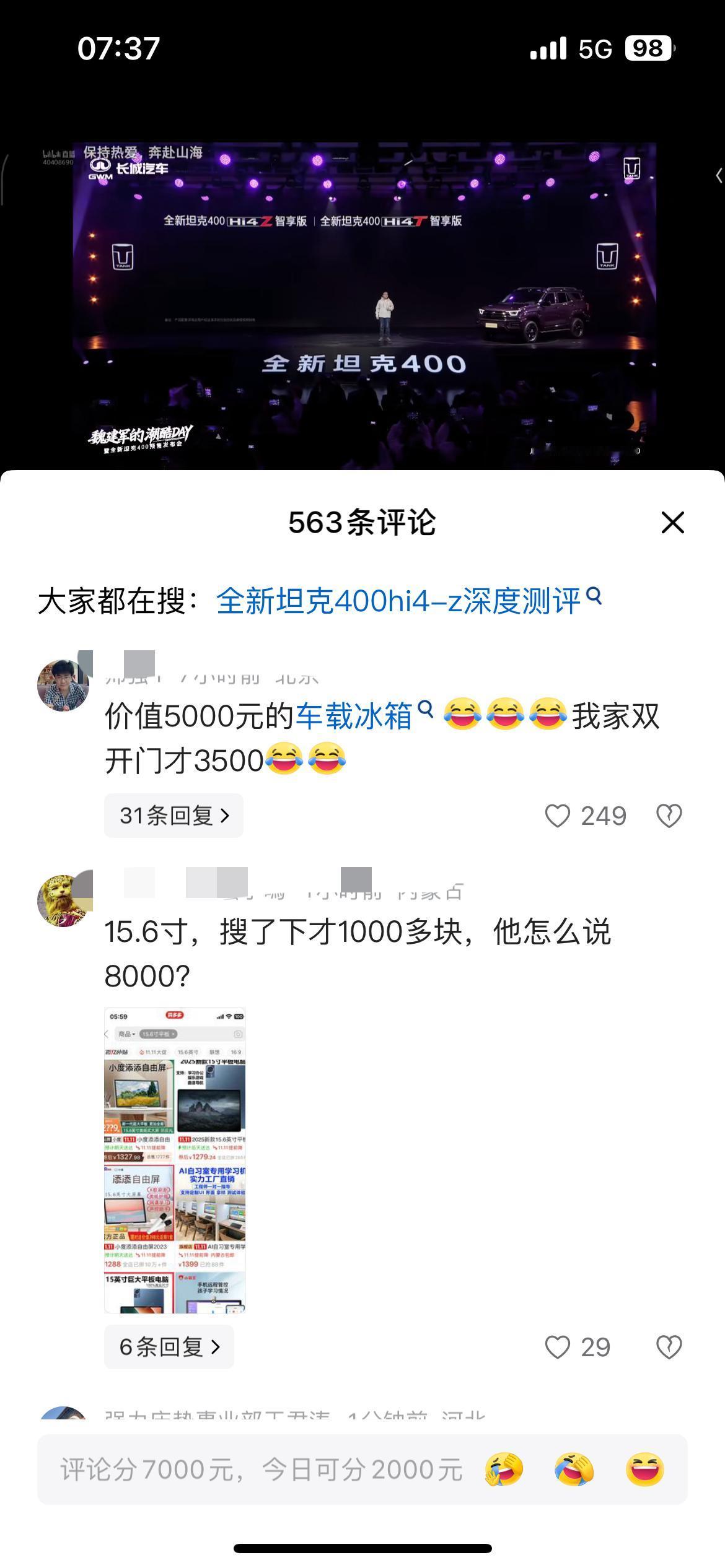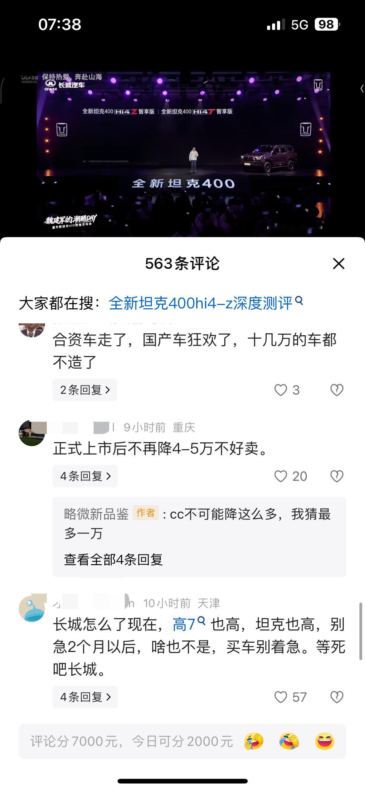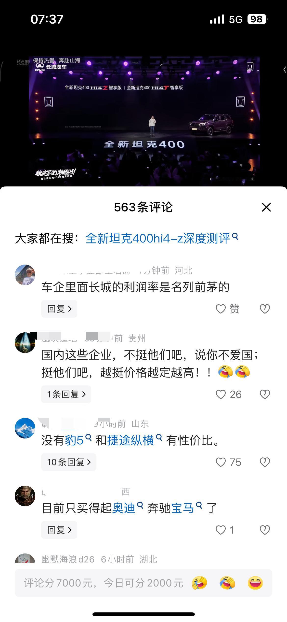 “要是没有进口车,这车能卖到100万还没优惠!” 全新坦克400一经发布,便遭网友疯狂调侃。 “价值5000元的车载冰箱[笑哭],我家双开门冰箱才3500元” “价值8000元的15.6寸后排娱乐屏” “魏子跟雷子学坏了” “如今长城车没性价比了” “国内这些企业,不支持它们吧,说你不爱国;支持它们吧,越支持价格越高!” “在车企里,长城的利润名列前茅” 以上都是网友评论,一是调侃长城的营销学雷军,二是觉得价格高得离谱。不过有热心网友给出如下建议: “豹5才23万起,这坦克400有点贵啊!” “给我一个不买纵横700的理由” “目前我只能买得起奥迪、奔驰、宝马了。”