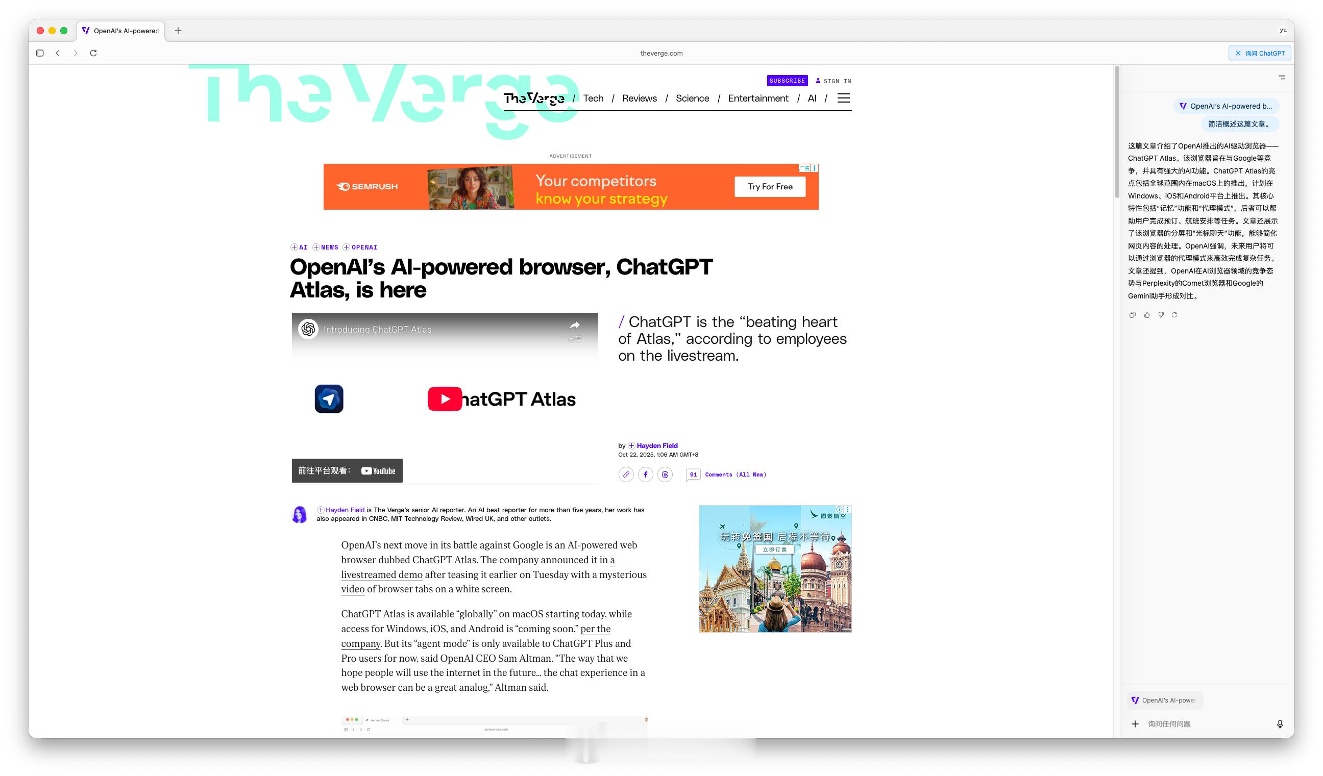 OpenAI 新出的浏览器 Altas 对我来说首先要替代的不是 Chrome、Dia 浏览器,而是 OpenAI 自己的 ChatGPT 桌面应用。