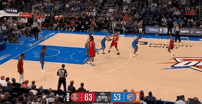 雷霆防守悍将卡鲁索真是太生猛了!NBA常规赛揭幕战,在雷霆对阵火箭的第三节比赛中