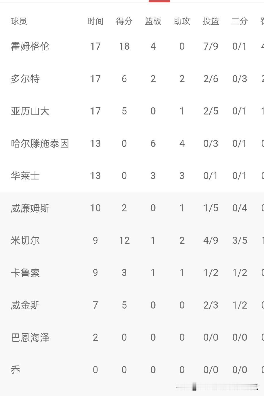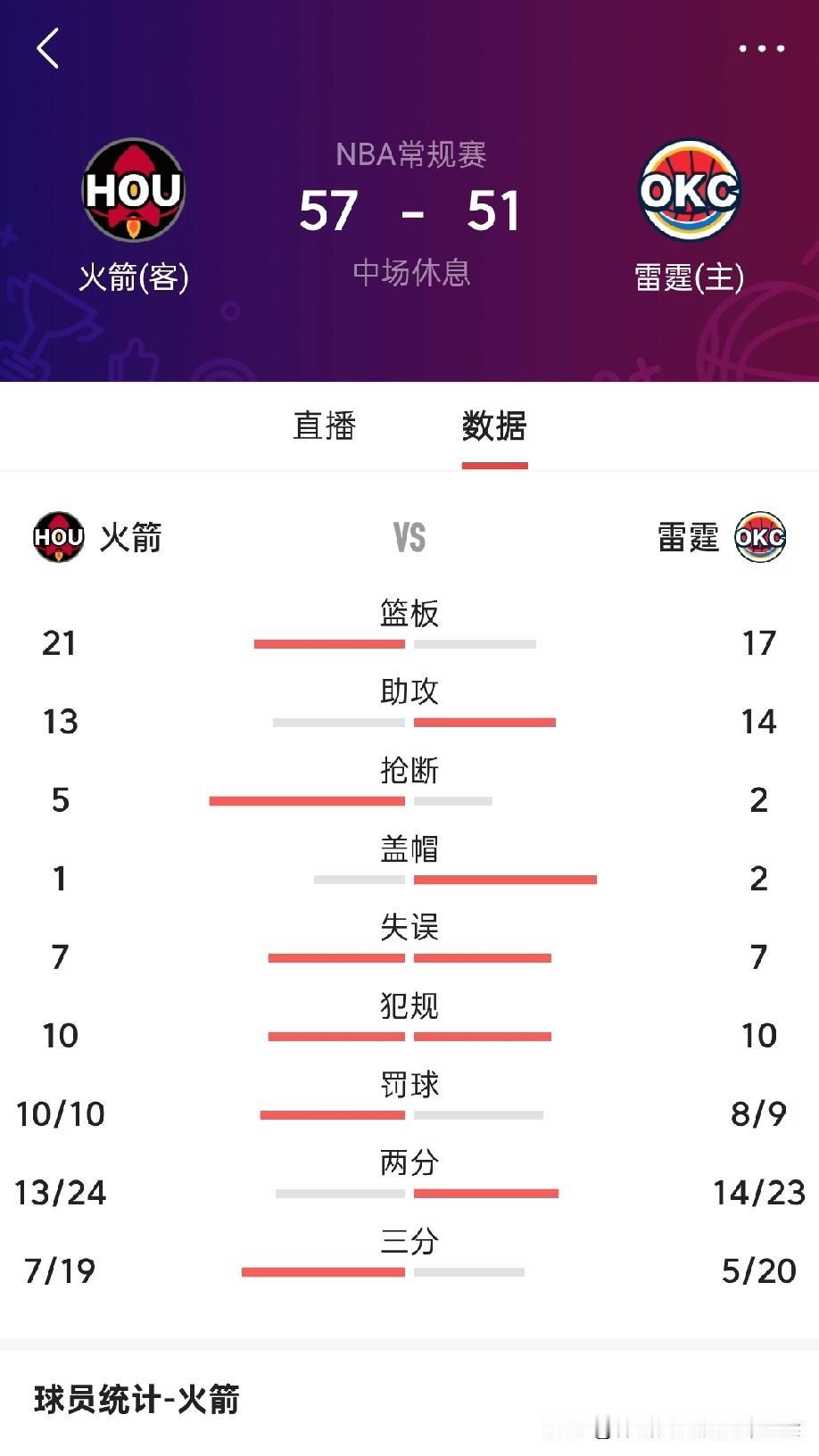 火箭半场57-51领先雷霆6分。半场火箭三分球命中率以及篮板占优,其余与雷霆半斤