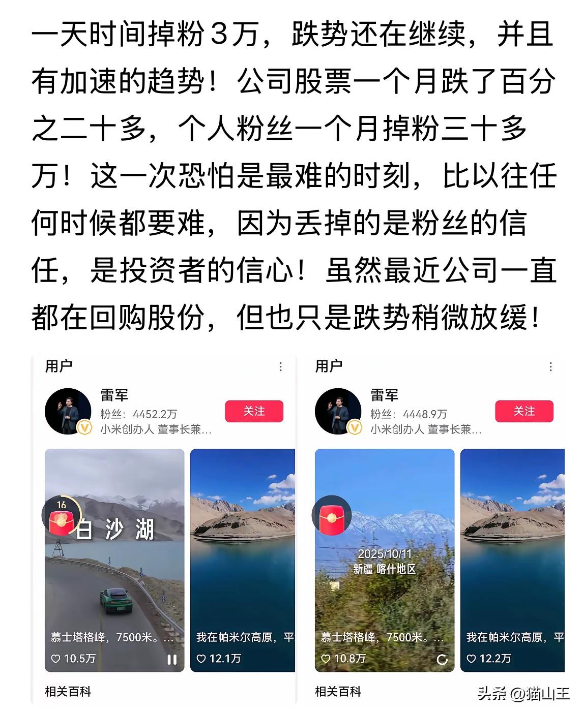雷总的粉丝数一直在掉, 现在的小米成了人人喊打的对象, 可是回过头来看,创业不易,小米能有如此大的成就了不起了。 我们还是要以宽容的心对待小米跑,对待雷总。提点建议,希望小米踏实做好技术,研究技术,事关人身安全的产品,还是要沉下心去做去验证,互联网的快速迭代可能并不适用了!