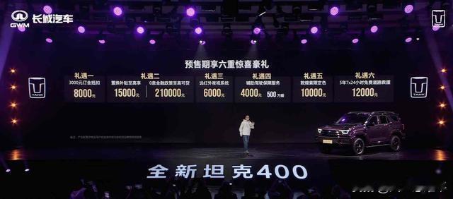 2025年10月21日,新款坦克400智享版正式开启预售,推出Hi4-T和Hi4-Z两种动力版本,预售价分别为30.98万元和32.98万元。 新款坦克400智享版车型将配备激光雷达,搭载第三代Coffee Pilot Ultra辅助驾驶系统。同时,预售期订车用户可尊享六重豪礼,包括3000元定金抵扣8000元购车尾款、至高15000元的置换补贴或21万元的0息金融政策、免费赠送远红外夜视系统、免费赠送辅助驾驶保障服务、免费赠送敦煌紫全新配色以及5年不限里程和地域的全天候道路救援服务等。坦克400 坦克400车标 坦克400中网