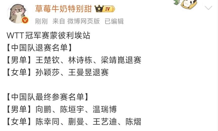 孙颖莎王楚钦蒙彼利埃冠军赛确认退赛, 另外还有王曼昱,林诗栋,梁靖崑也退赛。 目前可以确认的是中国队的五个主力都退赛了, 男队:王楚钦,林诗栋,梁靖崑退赛, 男队加了温瑞博进来, 最终是:向鹏,陈垣宇,温瑞博三位运动员参加。 女队:孙颖莎,王曼昱退赛 女队没有递补,还是陈幸同,蒯曼,王艺迪,陈熠参加。 主力们经常多站的密集比赛,并且兼项很多, 需要休息, 也需要好好备战全运会了。 那就全运会见哦。