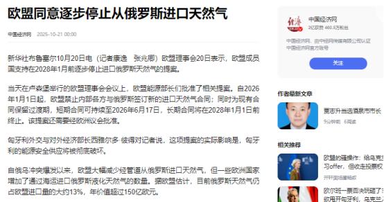 欧盟用最大力气把俄罗斯推到中国一边,欧盟将从2026年1月1日起,禁止成员国和俄罗斯签订新的进口天然气协议。 现有的短期合同能撑到2026年6月17日,长期合同最晚2028年终止。这相当于给俄欧能源合作判了"死刑",但欧盟没想到,这刀下去,疼的是自己的钱包。 欧盟为啥这么干?主要是想摆脱对俄罗斯的能源依赖。俄乌冲突爆发后,欧盟大幅减少了从俄罗斯进口管道天然气,但通过海运买俄罗斯液化天然气的国家还不少。2025年,俄罗斯天然气仍占欧盟进口量的13%,一年能挣150多亿欧元。欧盟觉得这钱等于变相资助俄罗斯打仗,于是痛下决心"断气"。 可欧盟的算盘打错了,俄罗斯早就料到会有这一天,提前好几年就在布局东方市场。2024年,俄罗斯对华天然气管道输气量达到310亿立方米,液化天然气出口860万吨,中国成了俄罗斯最大的天然气买家。 更绝的是中俄签了"西伯利亚力量1号"管道扩容协议,年输气量从380亿立方米提到440亿立方米,还计划2027年建成"远东线路",每年再送100亿立方米天然气到中国。俄罗斯天然气工业股份公司更是放出话来,未来几年要把对华输气量提到每年1060亿立方米,相当于中国现在天然气消费量的四分之一。 欧盟这边呢?想找美国买液化天然气,可美国产能根本跟不上。2024年,美国对欧盟的LNG出口占比已经到45%,但要完成美欧能源协议里每年2500亿美元的采购目标,还差得远呢。 更坑的是美国LNG价格比俄罗斯管道气贵得多,欧盟企业用不起。德国工业电价已经涨到每千瓦时0.3欧元,是美国的两倍,巴斯夫、西门子这些巨头都把生产线搬到中东和美国去了。2024年,欧盟制造业外流规模达到1200亿欧元,相当于每个欧盟家庭多掏了900欧元的"断气税"。 虽然欧盟想靠可再生能源顶上来,可进展太慢。2023年,可再生能源只占欧盟能源消费总量的24.5%,离2030年42.5%的目标还差18个百分点。 更麻烦的是可再生能源不稳定,2024年12月,德国因为风力不足,电价涨到每兆瓦时936欧元,创了18年新高。老百姓怨声载道,4600万欧洲人陷入"能源贫困",连洗澡都要算计着用热水。 欧盟内部也吵翻了天,匈牙利、斯洛伐克这些东欧国家,70%的天然气靠俄罗斯管道供应,直接跳出来反对。匈牙利外长西雅尔多·彼得说,欧盟这政策是"自杀",会彻底破坏匈牙利的能源安全。 2025年10月的欧盟峰会上,匈牙利威胁要否决这项提案,最后欧盟只能妥协,给匈牙利多了两年过渡期,还答应给10亿欧元补贴。可这点钱连匈牙利一年的天然气进口费都不够,明摆着是打发叫花子。 俄罗斯这边倒是过得滋润,2024年,俄罗斯对华能源出口额突破1200亿美元,占俄外贸总额的38%。中俄还搞起了本币结算,40%的油气贸易用人民币和卢布直接交易,美元在欧亚大陆的影响力被狠狠削弱了。 更绝的是俄罗斯把蒙古拉进"西伯利亚力量2号"管道项目,这条管道建成后每年能送500亿立方米天然气到中国,蒙古每年能收15亿美元过境费,三国绑得更紧了。 很明显欧盟这招"断气",不仅没掐住俄罗斯的脖子,反而把自己的工业体系掐得奄奄一息。2025年第三季度,欧盟GDP萎缩0.7%,通胀率涨到6.3%,食品价格比2021年翻了一番。更讽刺的是欧盟花高价从美国买的LNG,有一部分是俄罗斯卖给美国的。美国从俄罗斯进口天然气,再倒手卖给欧盟,一吨能赚300美元,妥妥的中间商赚差价。 现在欧盟骑虎难下。想反悔吧,面子上过不去;继续执行吧,经济撑不住。这场能源豪赌,欧盟输的没剩啥了。 来源:中国经济网 【欧盟同意逐步停止从俄罗斯进口天然气】
