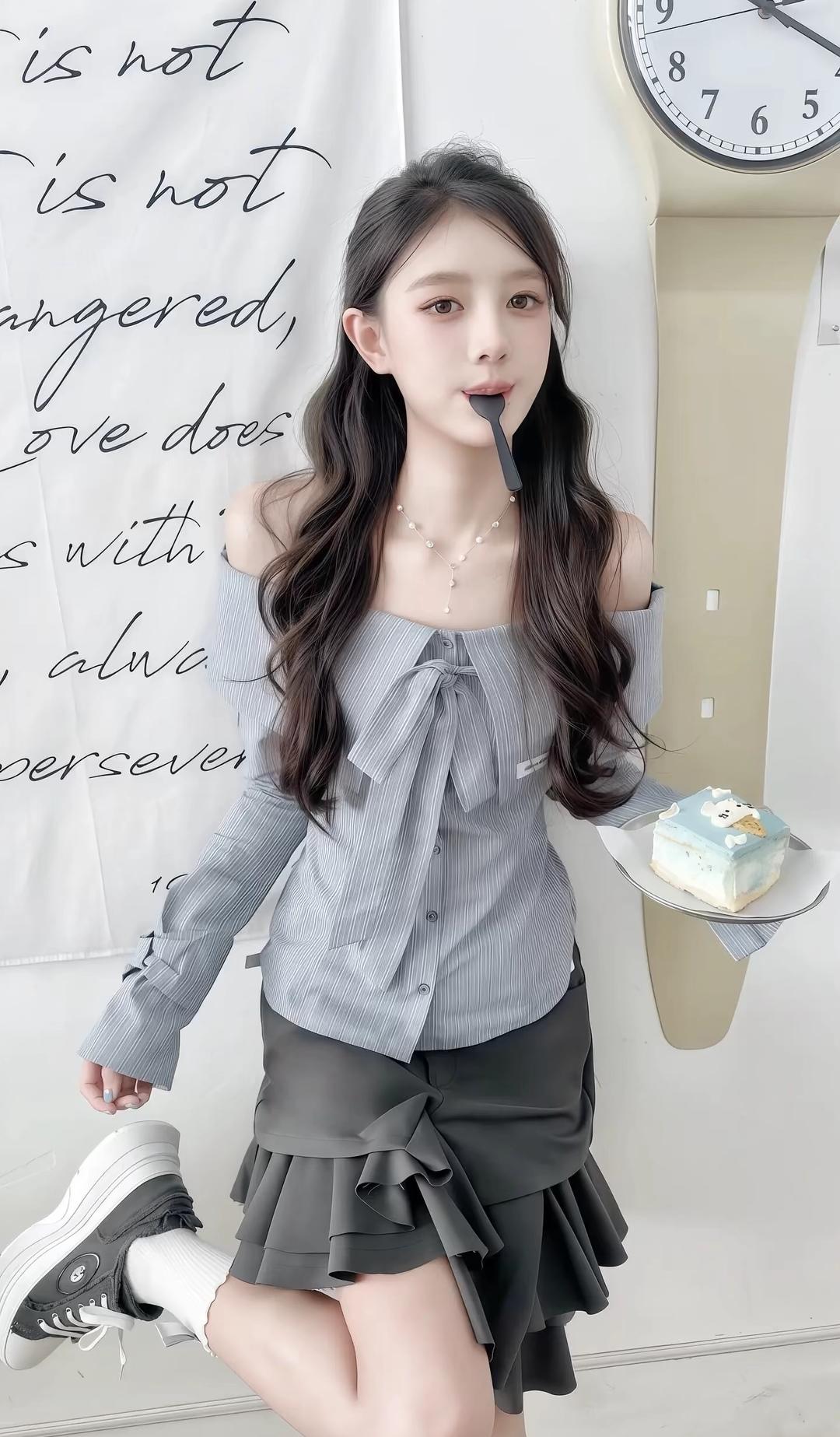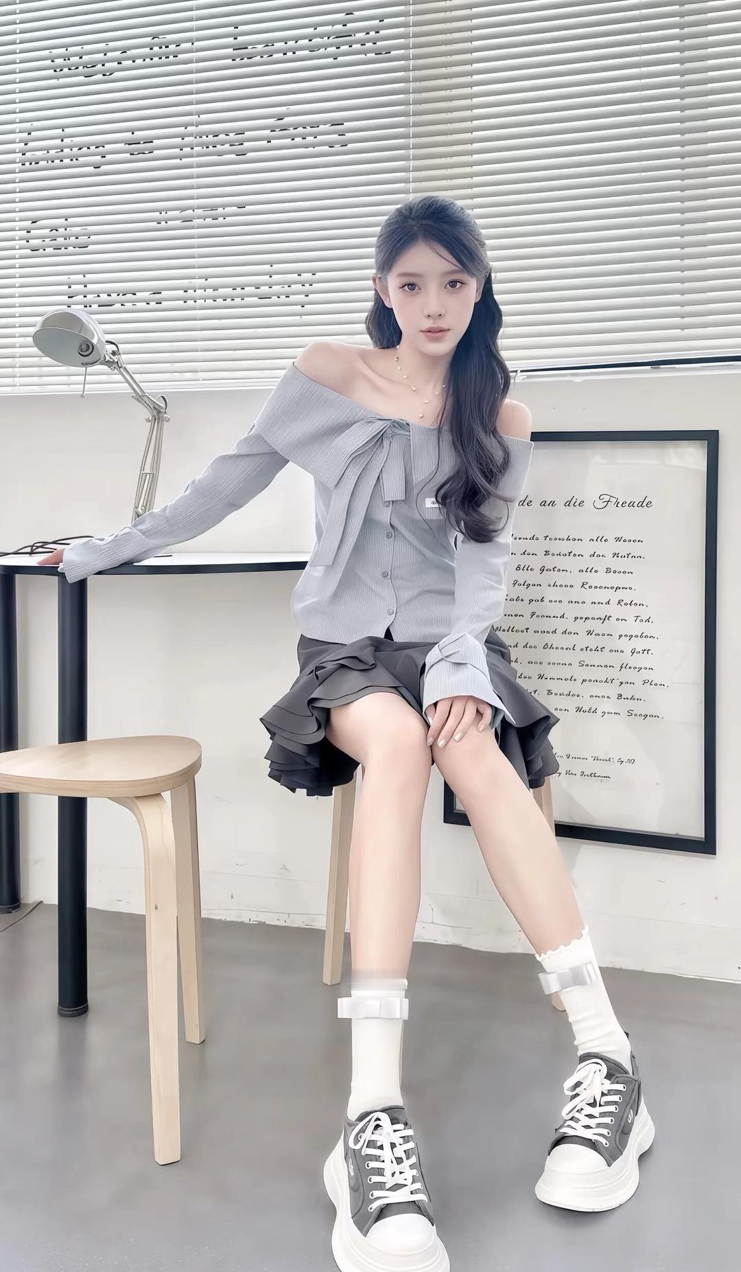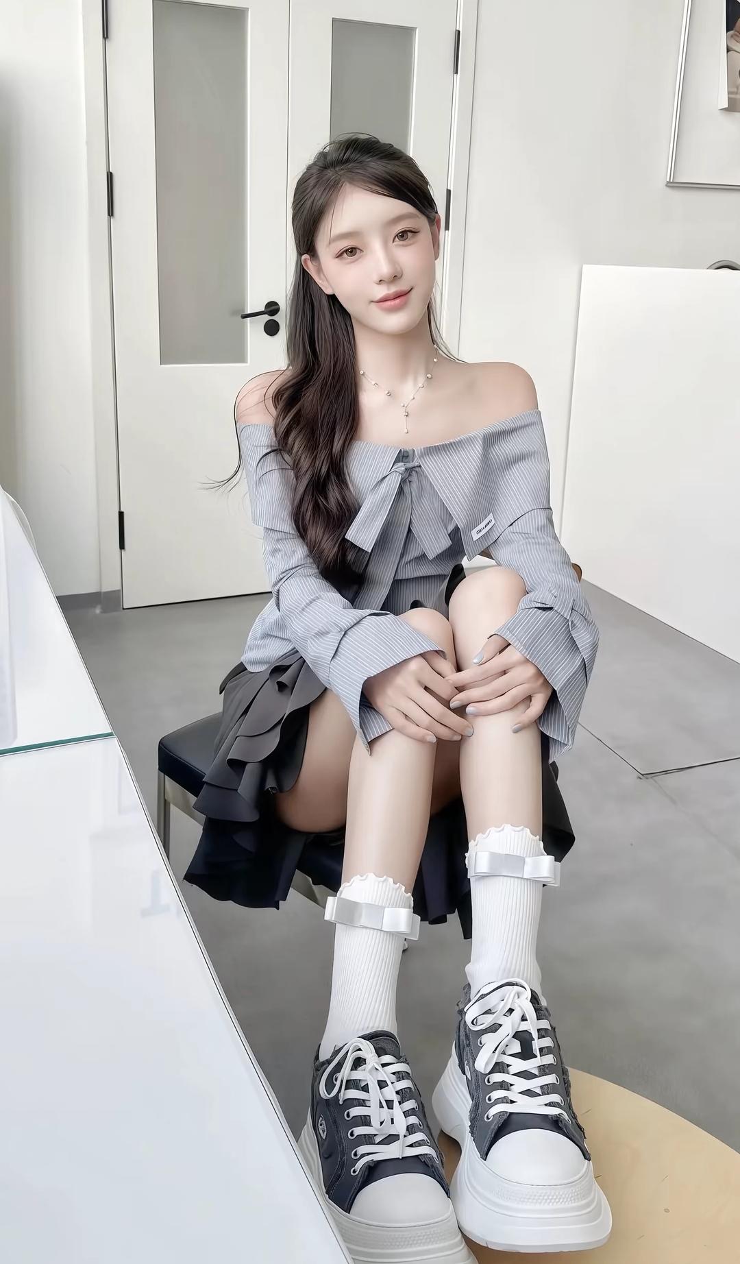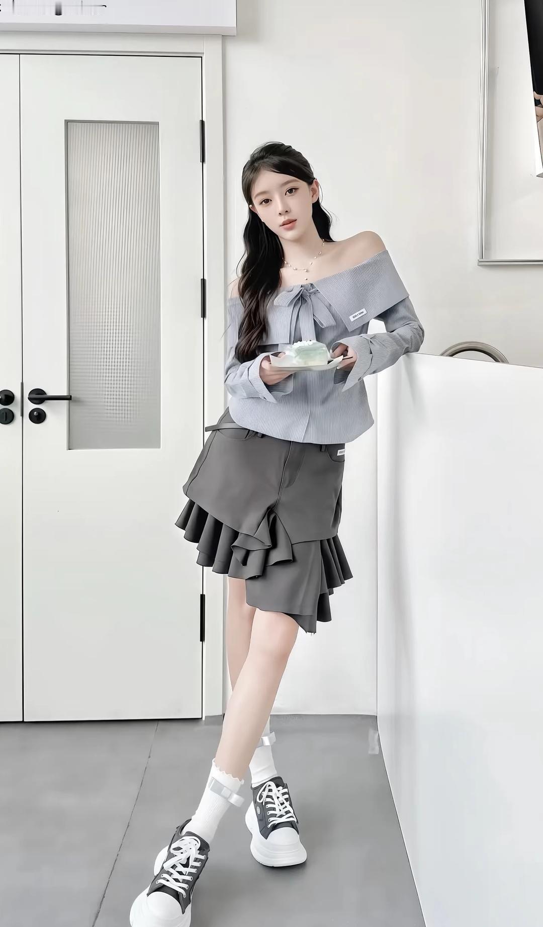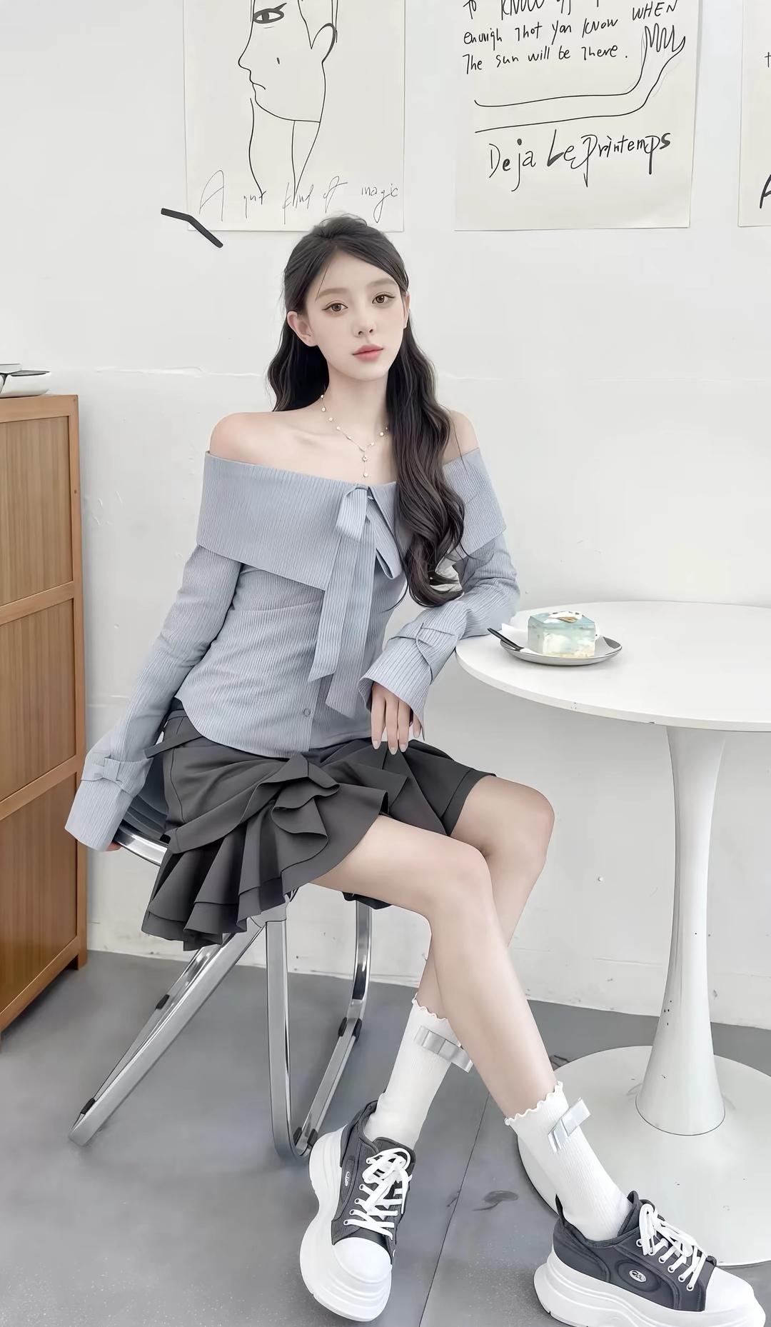 日系少女风穿搭,灰色露肩上衣搭配棕色百褶裙,白色袜子和帆布鞋,清新自然。