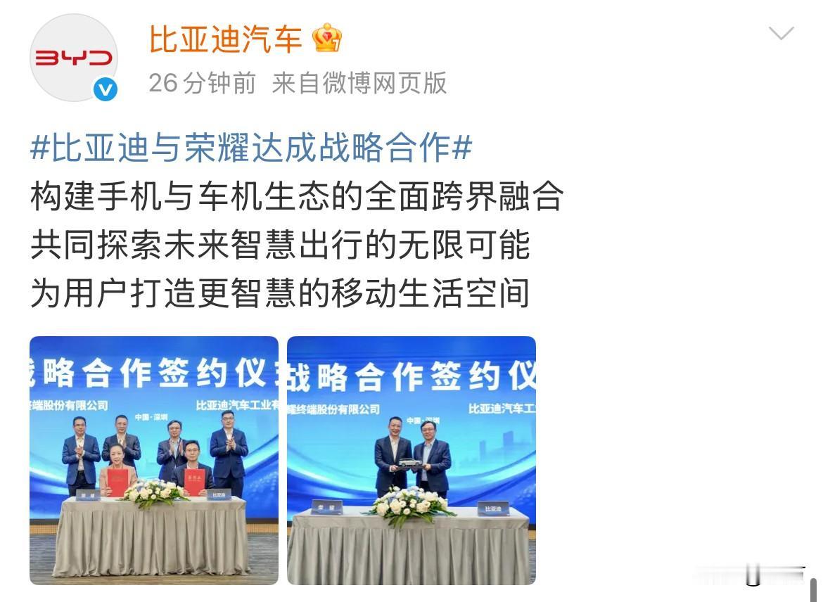 比亚迪:我们与荣耀达成战略合作! 就在刚才,比亚迪的社交官方账号放出了两张图片,王传福与融洽的老总站在一起! 他们两个手上拿的是战略合作签约仪式的本子,这也就意味着,两家企业接下来又要起来干点大事了! 一个是做手机的,一个是做汽车生态的,他们两个强强合作,可以把手机与生态进行全面的跨界融合! 这一点对于比亚迪来说还是很重要的,因为他们的车技系统真的需要做得更加的丝滑,贯通一些,而荣耀在这方面的专业能力是没有问题的! 所以今后比亚迪的车技系统,与现在比可能会有有一个本质上的改变,毕竟专业的事情交给专业的人来做,他才会做出不一样的感觉。 我们拭目以待!