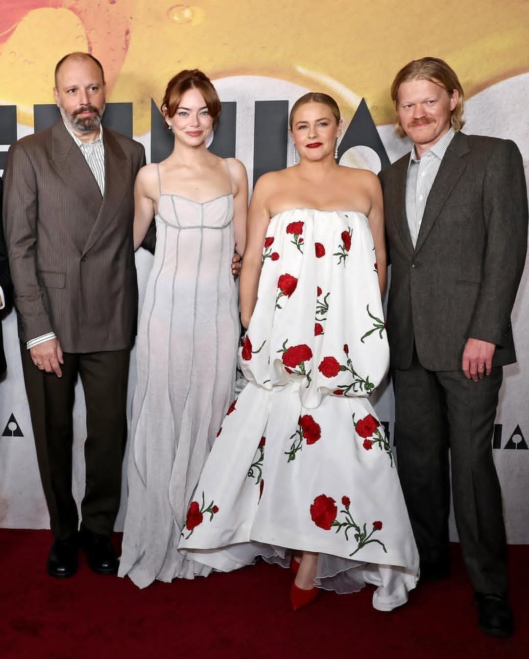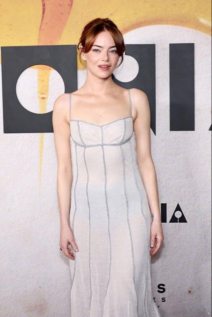 艾玛斯通身穿LV上个月刚发布的2026春夏系列吊带裙出席主演电影《拯救地求》纽约首映红毯
