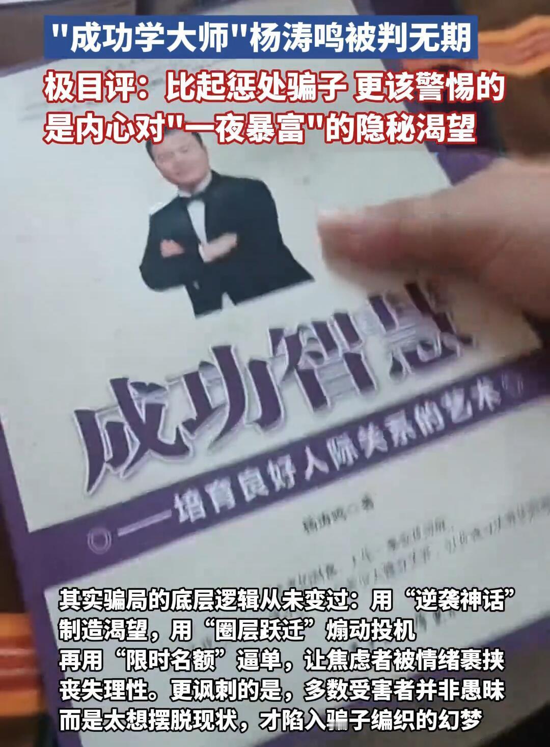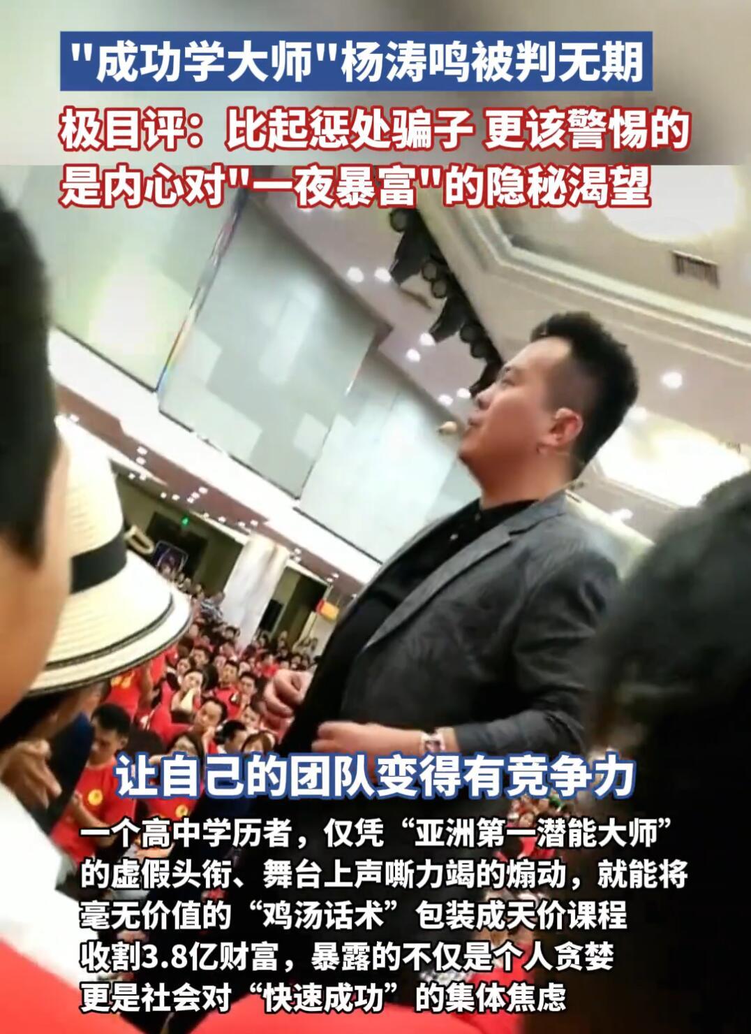 “亚洲第一潜能激励大师”杨涛鸣这事儿,总算判了无期,他老婆也搭进去11年。这哥们儿真名叫杨武成,高中学历,靠着一套忽悠功夫,7年骗了3.8个亿,现在钱被没收,人也得蹲一辈子牢。这案子二审维持原判,算是尘埃落定,但留下的烂摊子可不止这堆数字。 你瞅瞅他那套路,其实low得不行。先给自己编个“27岁开公司、28岁开劳斯莱斯”的人设,再搞点“吸管插土豆”“脚踩火炭”的杂耍,愣是包装成“潜能开发”,甚至吹牛说能给学员“灌顶传功”、接上“宇宙财富能量”。课程全是网上抄的鸡汤,居然敢卖到5800到60万,有人最高被骗了68万——这得是多想一夜暴富才会上这当? 更损的是他们玩心理战。现场安排托儿演戏,哭爹喊娘说“我悟了”“订单翻倍了”,再编几个“三个月赚百万”的假案例,配上“名额有限”“不投资就被淘汰”的话术,专挑人软肋下手。受害的七成是没啥钱的普通人,两成是小老板,有人刷爆信用卡,有人卖房交学费,结果债台高筑。你说他们傻吗?不如说是太焦虑,太想“改命”了。 法院这判决没毛病,追回来1.2亿,但剩下2.6亿估计难找了。问题是,杨涛鸣倒下了,可这类骗局压根没断过。从早年陈安之到他,套路永远一样:画个“快速成功”的大饼,忽悠人走捷径。说白了,法律能收拾骗子,但治不了人心里的贪念。 要我说,真大师要有点石成金的本事,早闷声发大财了,谁还天天站台卖课?这3.8亿背后,全是普通人的血汗钱,也是被焦虑逼出来的幻想。这案子最实在的提醒就一句:成功没捷径,那些号称能一夜暴富的野路子,刑法里早给你安排得明明白白了。