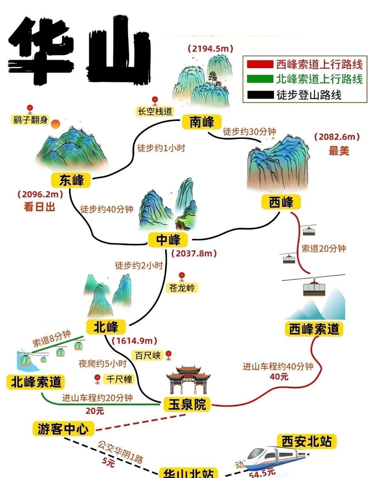 🚙行程安排 - Day1(西峰上,深度游):游客中心→西峰索道→西峰→南峰(长空栈道)→东峰(鹞子翻身、看日落)→中峰 - Day2(北峰下,体验徒步):中峰→北峰(擦耳崖、苍龙岭)→北峰索道→游客中心 🍰美食建议 - 山上补给:带能量棒、巧克力、自热饭(山上餐食贵且一般),东峰、南峰附近有小店卖泡面、凉皮,凑合垫饥。 - 山下必吃:华山脚下大刀面,劲道入味;华山论剑酒文化主题餐厅,尝当地特色菜“华山五针松菇”,鲜美独特;还有肉夹馍,酥脆掉渣,肥瘦相间超香~ 💰费用明细 - 交通:西安北→华山北动车 54.5元;华山北→游客中心公交5元;进山车(西峰40元、北峰20元 );索道(西峰单程140元、北峰单程80元 ),交通总计约 339.5元(按西上北下算)。 - 门票:华山门票160元(旺季) 。 - 美食:山下正餐人均30 - 50元,山上补给自购,三天预计100 - 200元 。 - 总计:单人两天行程,不算其他消费,大概 599.5 - 699.5元(以实际为准,淡旺季门票有差)。 🕳️避坑技巧 - 长空栈道、鹞子翻身需额外付费(30元/项),且排队久,怕高别勉强,提前备好现金(部分设备只收现金押金)。 - 别信“山上住宿很便宜”,东峰、西峰观景房周末超贵,预算有限可住中峰多人间,或夜爬选北峰凑合(但休息不好)。 - 夜爬别带太多行李,轻装上阵!手电筒不用买超亮大功率的,手机电筒足够,省重量~ ✌️美景打卡 - 西峰:索道上来就被震撼!山势陡峭,峰顶翠云宫古色古香,“斧劈石”传说感拉满,拍照很出片。 - 南峰:华山最高峰!长空栈道太刺激,悬崖边挪步,脚下万丈深渊,挑战完超有成就感,峰顶俯瞰群山,壮阔到失语。 - 东峰:看日出绝佳点!凌晨摸黑等破晓,天际渐红,太阳跳出云海那刻,所有疲惫值了,鹞子翻身也在这,悬崖绝壁上攀爬,刺激加倍。 - 中峰:相对安静,玉女祠藏着古典美,清晨山间薄雾环绕,像仙境,适合拍氛围感照片。 - 北峰:“华山论剑”打卡地!擦耳崖、苍龙岭徒步超有挑战,窄道贴山壁,一步一惊心,感受“奇险天下第一山”的魂~ 🎈游玩心得 华山真的“痛并快乐着”!西上北下路线,既坐索道赏全景,又徒步体验险道,两天把精华全逛到。夜爬虽累,但日出值得;白天徒步,奇峰险石震撼到不行。不过一定备好护膝、舒适鞋,山路太费腿!避开节假日人挤人,错峰出行体验感翻倍~征服华山,是身体在地狱,眼睛在天堂,这趟“自虐”之旅,难忘又值得!