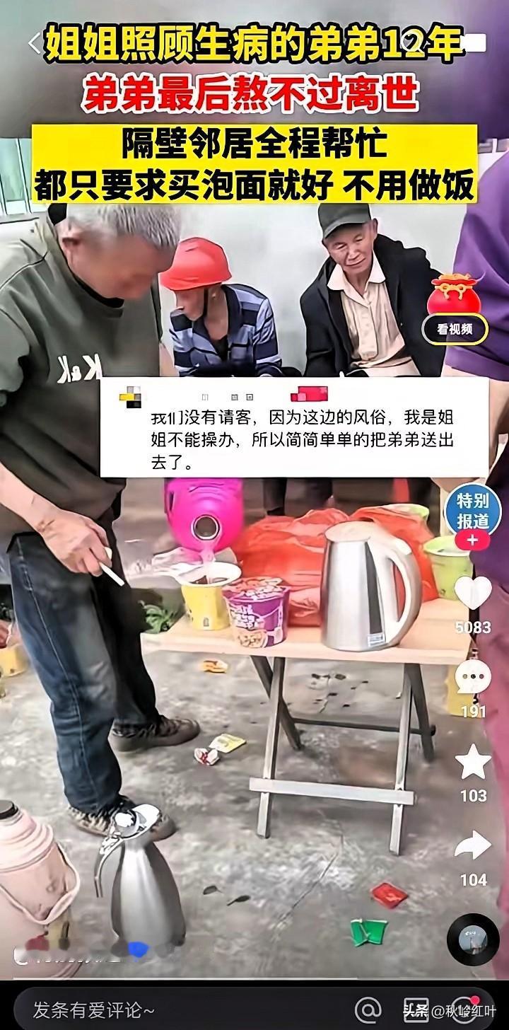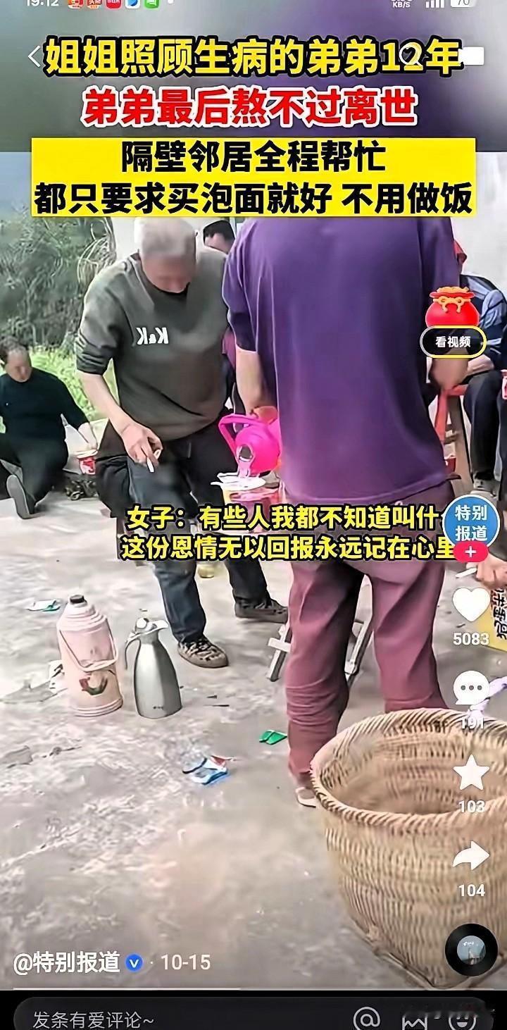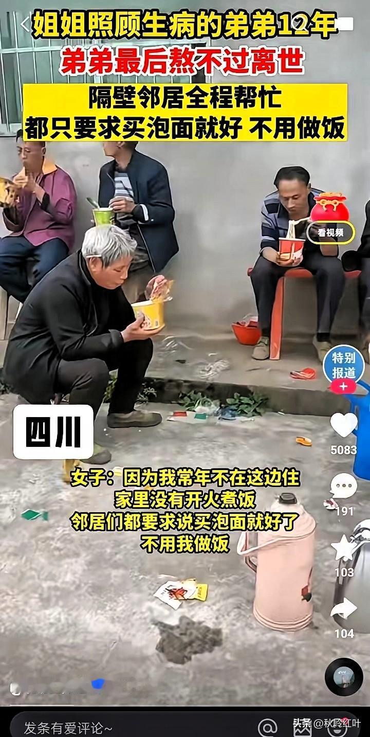 催人泪下的一幕!刷到小丽的故事,鼻子一酸眼泪就下来了! 四川这个姑娘打小没了爹妈,跟弟弟相依为命,好不容易熬到自己结婚,原以为能跟弟弟互相照应着好好过日子,可婚后才两年,弟弟就查出了癌症,直接瘫在了床上。 她没半点犹豫,跟丈夫商量后就搬回了娘家。这一守,就是整整12年!每天天不亮就起来给弟弟擦身、喂饭、端药,弟弟夜里疼得哼哼,她就坐在床边握着弟弟的手,一陪就是一整夜。 为了凑医药费,她把自己的首饰卖了,平时连块肉都舍不得买,衣服穿得洗得发白也不换,家里的积蓄花光了就去跟亲戚借,身边人都说她傻,可她就认一个理:“这是我唯一的弟弟,我不能不管。” 可就算她拼尽全力,最后还是没能留住弟弟。办后事那天,小丽红着眼眶要去厨房做饭招待帮忙的邻居,没想到大家一下子围上来拦住她:“别做了别做了!我们泡碗泡面就行,你快坐下歇会儿!” 谁不知道泡面没营养?这群邻居是看着小丽熬了12年,人瘦得脱了形,眼窝陷进去,鬓角都有了白头发,实在不忍心让她再受累。 都说久病床前无孝子,可小丽用12年的时间,把“姐姐”的责任扛得稳稳的;也有人说现在邻里情淡了,可这些邻居的举动,却让人觉得心里暖烘烘的。 其实人间的善意,从来都不是什么惊天动地的大事,就是在你最难的时候,有人愿意伸把手,替你多分担一点。你们身边有没有这样朴实又暖心的邻居?