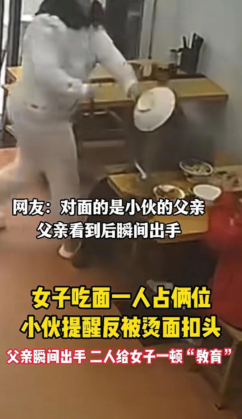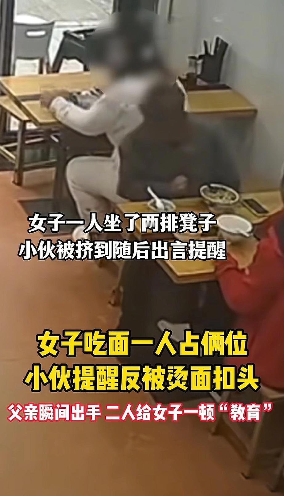 “小伙被汤面扣头?”浙江杭州,女子吃面时一人占了两排座位,结果坐在后面的小伙好心提醒她。然而令人没想到的是女子竟然把面扣到了小伙的头上。 不得不说,这个女子也太冲动了吧!也不知道女子是不是故意占的两排座。后排男子好心提醒,却遭到女子扣面对待。男子也不惯着她,直接回了手。 网友热议,有网友说:“任何女人在男人面前就别谈防御力了,正常男人只是不想动手,真出手你就没了。” 也有网友说:“我发现女人和男人的区别就是,在发生冲突后,女的总是突然打一下就头也不回的跑,就和小孩子打闹一样感觉跑了好像就没事了一样,这是什么原因?” 真是应了那句“冲动是魔鬼”,有事好好说不行吗?非要动手。