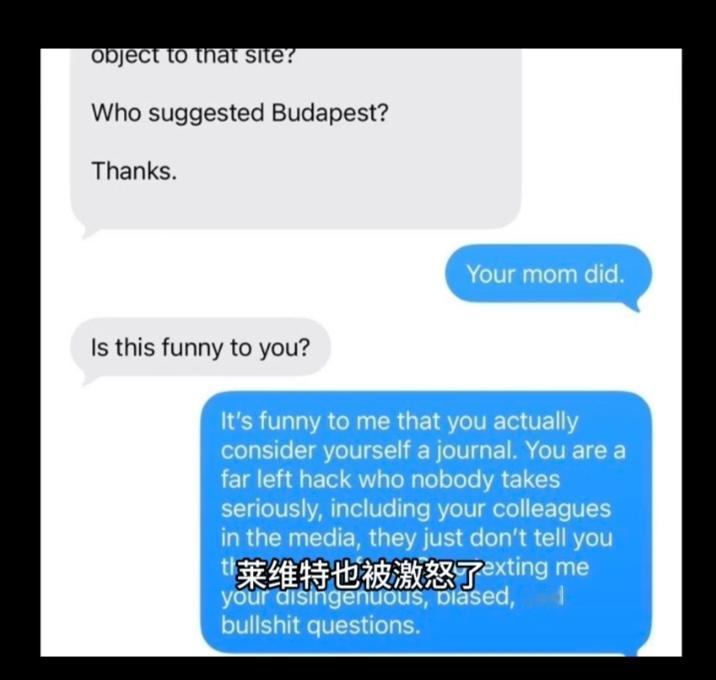 美国白宫发言人卡罗琳说“你妈说”的聊天记录被那个记者发出来了,卡罗琳非常的生气,还说了非常长一段话,说记者不真诚的人老是问这些充满偏见的问题,以后不要再给她发信息了。 而问卡罗琳的那个记者也不是好惹的,随后他也发了一条推特说,我妈妈告诉我,她并不希望在布达佩斯。 谁能想到白宫发言人的素质是这样的,即使在私底下,也不该这样口无遮拦呀。难怪大家都说这个世界就是草台班子,以为他们的工作很高端,没曾想那只存在普通人的想象中。
