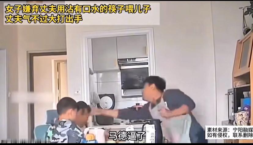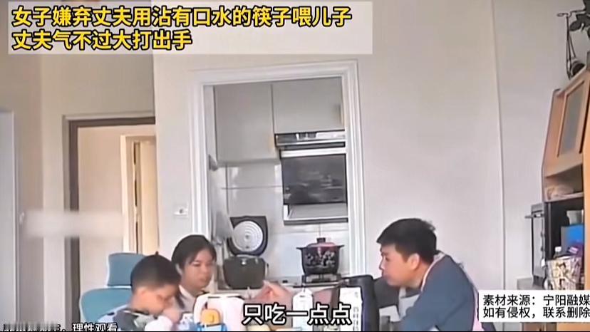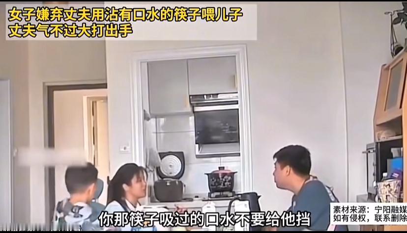 男子拿私筷喂儿子饭,老婆嫌弃,男子气不过,打了老婆一巴掌。 这么小个事,本来可以