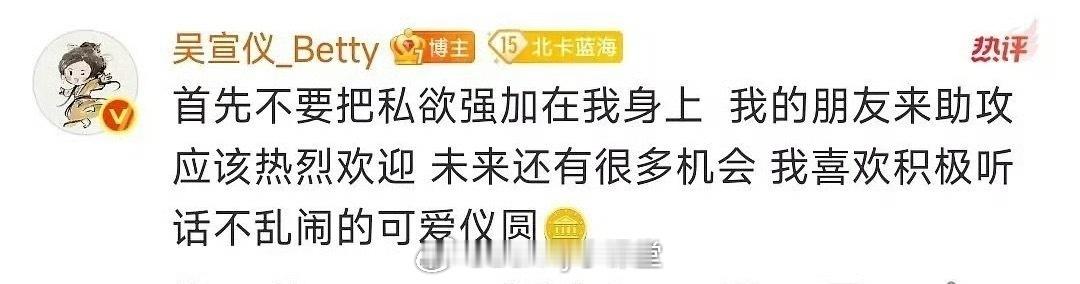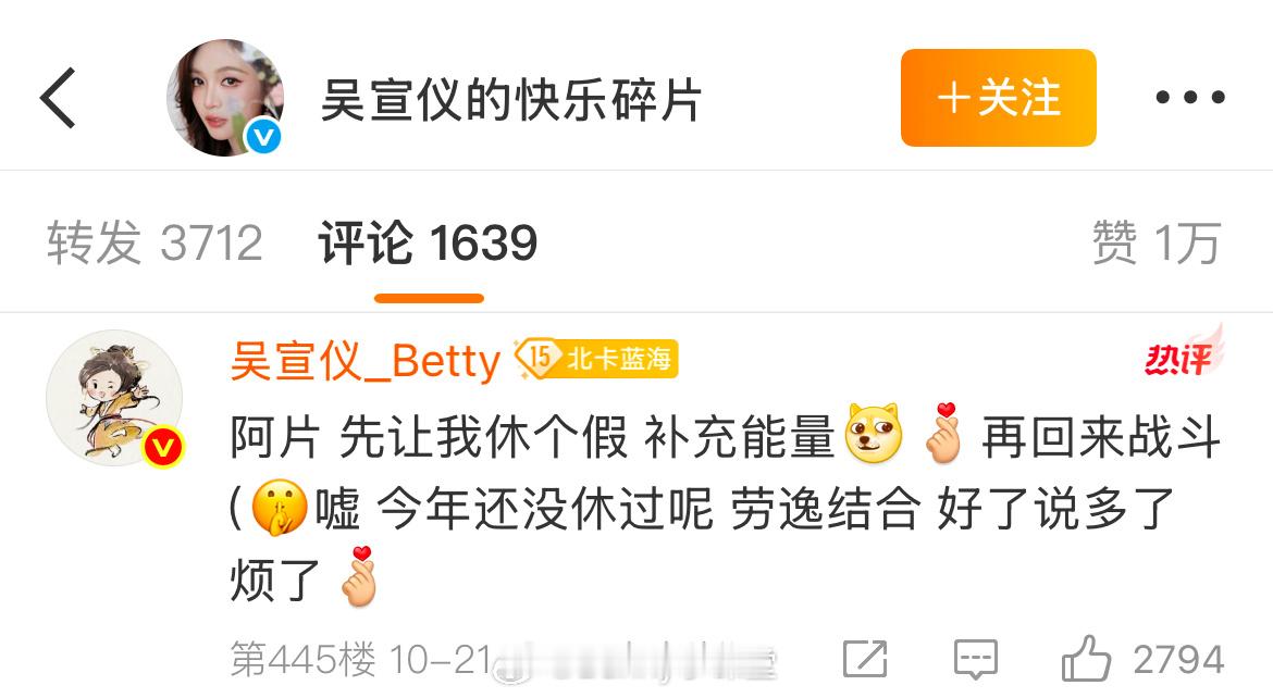 粉丝让吴宣仪多营业,进组拍戏,没想到吴宣仪评论说要先休假,说多了就烦了。这不是吴宣仪第一次怼粉,之前还喊话“喜欢积极听话不乱闹的粉丝”,但是她本人却常常晒超话签到图……既要又要,吴宣仪训粉这块[桃里桃气]