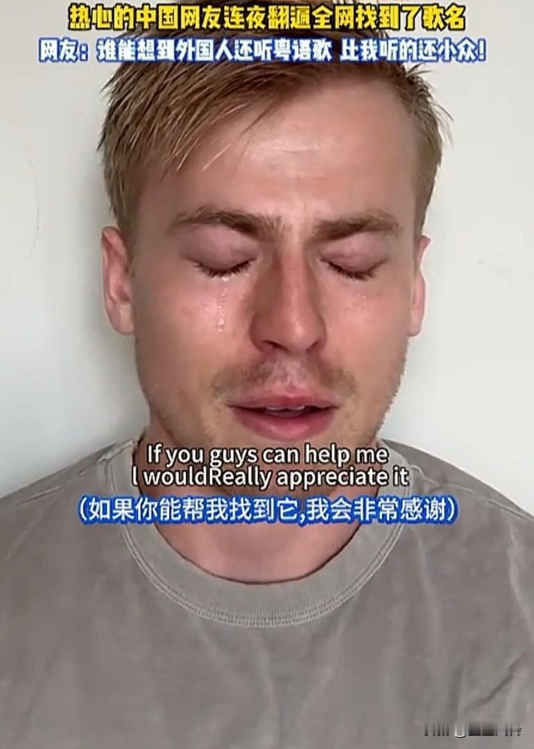 怎么哭了他还听得懂粤语? 外国小哥求助中国网友找到他超爱的一首粤语歌曲 他应该是明白这个歌词的意思了,他都要哭,他如果能看懂歌词是不是会更悲伤?被广东妹子伤的不轻,记不住的小众歌,确实不好找。不是这首歌多好听,是这首歌带给他的回忆
