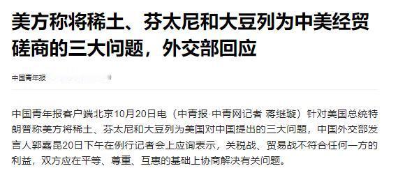 美军双航母压境,特朗普提出三大要求,勒令必须满足,中国全部拒绝!特朗普向中方提出三大要求被拒,无奈之下,美军再度使出“双航母”战术,希望逼迫中国低头,但美方显然打错了算盘。 10月19号,特朗普接受媒体采访的时候,又把中美大豆贸易、稀土出口和“芬太尼问题”当成了谈判的“三张王牌”,硬要中国无条件让步。但咱中国哪是吃这一套的?直接就俩字:不答应! 先说说大豆贸易这事儿。特朗普还以为抓住了咱的“粮食命脉”,可他压根不知道,咱早就悄悄布局了。2025年这一年,咱从美国买的大豆量跌得那叫一个狠,单说9月份,干脆就没从美国进一粒大豆! 反而从巴西、阿根廷进的大豆多了不少,跟去年比,巴西的涨了快30%,阿根廷的都快翻倍了。这还不明显吗?咱中国买大豆的渠道早就不止美国一家了,根本不是非买美国大豆不可。而且咱国内也在扩大大豆种植,自己能种的越来越多,自给率慢慢在提。特朗普还想靠大豆拿捏咱?纯属想多了! 再聊聊稀土出口。稀土这东西被称作“工业维生素”,高科技领域根本离不了,美国一直盯着咱的稀土出口,这次特朗普又拿这个说事儿。可咱中国也不是好欺负的,今年10月9号,商务部都发公告了,稀土相关的技术出口要管得更严了。 这意思就是,往后美国再想从咱这儿拿到稀土开采、提炼的关键技术,可就没那么容易了。现在咱中国在稀土这块儿的话语权越来越大,特朗普这点小算盘,又打错了。 最后说下“芬太尼问题”。这事儿根本就是美国自家的内政问题,特朗普倒好,想把锅甩给咱中国。咱中国在管控芬太尼这块儿,一直走在全世界前面,早在2019年,就把所有芬太尼类的东西都纳入管控了,是全球最早这么干的国家之一。 今年3月,国务院新闻办还专门发了《中国的芬太尼类物质管控》白皮书,把咱做的努力和成果说得明明白白。再看美国,他们人口才占世界的5%,却吃了全世界80%的阿片类药物,芬太尼泛滥的根子就在美国自己国内,跟咱没关系。特朗普拿这个说事儿,就是想把国内的矛盾往咱这儿引,纯属转移视线。 面对特朗普这三个要求,咱中国态度很明确:全不答应!至于美军搞的“双航母”那套,在咱中国眼里就是纸老虎。这些年咱中国军事实力越来越强,南海、台海这些地方的防守能力也越来越硬。美军把航母战斗群开到咱家门口晃悠耍威风,咱可不怕这个,有足够的本事守住自己的主权和领土。 其实中美关系闹到现在这样,特朗普政府得负大责任。今年1月特朗普上台后,中美贸易战就更凶了,美国找各种理由给咱出口到美国的东西加税,咱也没怂,该反击就反击。虽说后来谈了几轮,双方的关税降了点,但特朗普政府那“美国优先”的破政策,一直是中美关系的绊脚石。 现在全世界经济形势都挺乱的,中美都是世界前两大经济体,好好合作才能都受益。可特朗普政府偏要搞“自己说了算”的单边主义,还老用霸凌那套,不光坑了中美两国的利益,对全世界经济也没好处。咱中国一直说,得在平等、互相尊重、互相得利的基础上商量着解决问题,但也不怕谁来施压、威胁。 美军摆双航母,特朗普提三大要求,这戏看着热闹,可结局早定了。咱中国有句老话说“邪不压正”,特朗普政府干的这些事,既不合国际关系的规矩,也跟不上时代的趟儿。咱中国会接着稳稳走自己的路,靠实力护好自己的利益和脸面,那些想靠施压让咱屈服的人,最后只能是自讨苦吃,碰一鼻子灰。