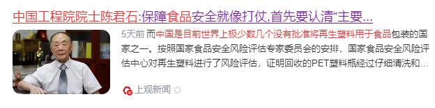 中国工程院院士陈君石:中国是目前世界上极少数几个没有批准将再生塑料用于食品包装的