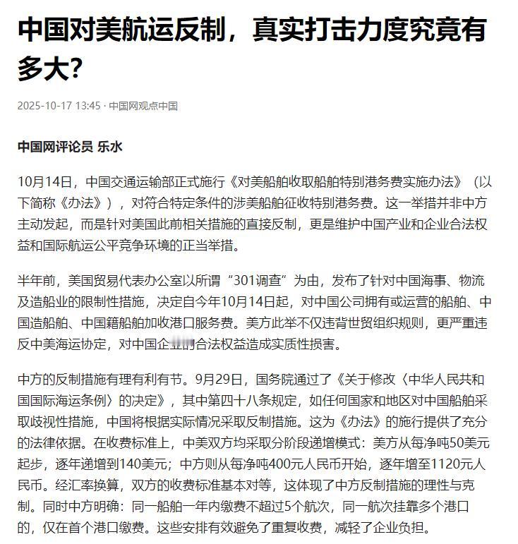 交不起了,实在是交不起了!由于中国的对等反制,很多美国的船只已经放弃停靠中国港口。 美国那艘叫“蔚蓝海岸号”的豪华邮轮,刚在中国港口停稳,就收到了一张1167万的账单。这船净吨位差不多2.9万吨,按中国新规矩,每净吨得交400块,一合计就这么多了。要我说这数是真吓人,一艘豪华邮轮跑一趟,净利润也就200到300万,这一笔港务费比跑好几趟赚的钱加起来还多,换谁不得愁死?美国船东协会都快哭了,说这哪儿是收费啊,简直是要命! 这事得从半年前说起,是美国先挑的头。他们拿“301调查”当借口,给中国的船舶加港口服务费,一开始每净吨50美元,还打算逐年涨到140美元。中国也不是软柿子,9月29号直接改了《国际海运条例》,明摆着说“你敢歧视我们,我们就跟你对着来,你怎么干我们就怎么反制”。10月14号这新规矩一落地,美国船东立马慌了神。 首先是收费这块,中国这起步价就比美国现在的高,每净吨400块,换算成美元差不多56块,而且到2028年还得涨到1120块,比美国以后的最高标准还多20%。就说“蔚蓝海岸号”,交这1167万,相当于他们跑5、6趟才能赚回来,船东辛辛苦苦忙半年,钱全给中国港口了,这不白干吗? 再就是管的范围,美国只针对中国籍的船,中国不一样,只要是美国企业间接持股超过25%的船,都算在内。全球一下子有3120艘船受影响,连摩根大通、花旗这些华尔街大公司控制的船队都跑不了。 哪怕船挂的是巴拿马国旗,只要背后有美国资本,该交钱还得交。还有执行起来一点不含糊,中国港口系统跟海关、税务都连了网,船要进港,得先把钱交了,不然直接拉黑名单,不让进。据克拉克森研究的数据,新规矩刚实施三天,就有27艘美国邮轮不敢来中国港口了,改成去东南亚停靠。 美国现在是搬起石头砸自己的脚,政府急得跳脚也没办法。这反制正好戳中他们三个要害。第一个就是他们的航运霸权不稳了。美国的航运资产在全球排第四,华尔街的资本控制着全球40%的商船融资租赁生意。 但中国这招“穿透式制裁”,一下让美国船东亏惨了。比如韩华海洋,他们美国子公司要负责美国一半的《琼斯法案》商船建造,现在因为被列入反制名单,订单直接少了一半。更搞笑的是,美国造 ships 的能力只有中国的1/230,根本没法替代中国港口的服务。 第二个是通胀更严重了。全球航运是连在一起的,中美这边闹摩擦,供应链成本直接涨了。世界航运理事会算过,每个从中国运到美国的集装箱,运费要涨600到800美元,美国消费者一年得多花300亿美元。摩根士丹利还警告,要是运费突破1000美元一个箱,美国的核心通胀率得往上跳0.2个百分点。这对本来就头疼的美联储来说,简直是火上浇油。 第三个是盟友也不跟他们一条心了。中国反制一出来,韩国、新加坡这些航运大国都赶紧说“我们保持中立”。更尴尬的是,美国盟友的船也被波及了。比如有艘船是日本商船三井运营的,但美国高盛持股,在中国港口也被收了1167万。日本媒体都忍不住说,美国搞单边主义,最后是让盟友替他们买单。 现在美国陷入两难了,继续跟中国对着干,航运业就得垮;要是服软让步,又怕丢了“全球霸主”的面子。但中国敢这么硬气,是有三个底气的。第一个是国内市场大,上半年消费总额就有24.5万亿元,还涨了5%,就算没有美国商船,国内的物流照样转。 第二个是港口厉害,全球前十的港口里中国占了七个,年吞吐量占全球30%,美国船不来,对中国港口没多大影响。第三个是有其他政策工具,除了港口收费,中国还握着重稀土、新能源这些“王牌”。比如10月9号中国刚宣布对稀土相关产品出口管制,这一下就戳中美国高科技产业的要害了。 其实这场航运较量,本质上是中美综合国力的比拼。中国用行动证明了,现在全球化时代,搞单边制裁没用,只有平等商量才能解决问题。就像交通运输部说的,“我们一直愿意坐下来谈,但前提是美国得改了那些错误的做法”。接下来就看美国了,是继续一条道走到黑,还是跟中国合作共赢。
