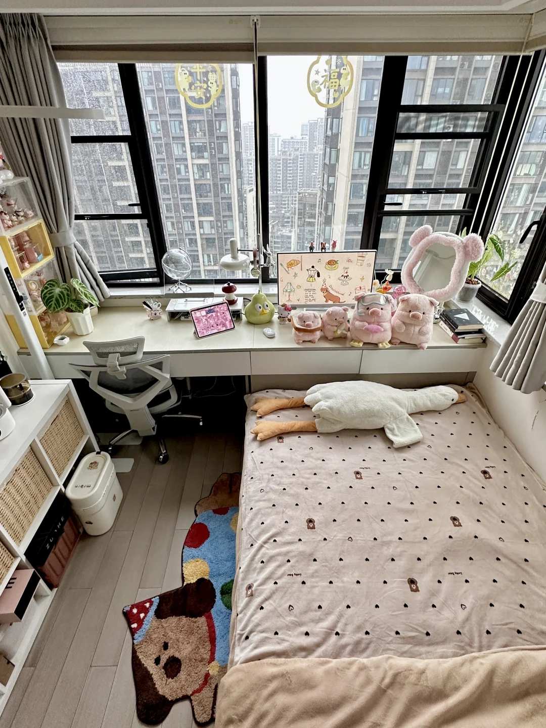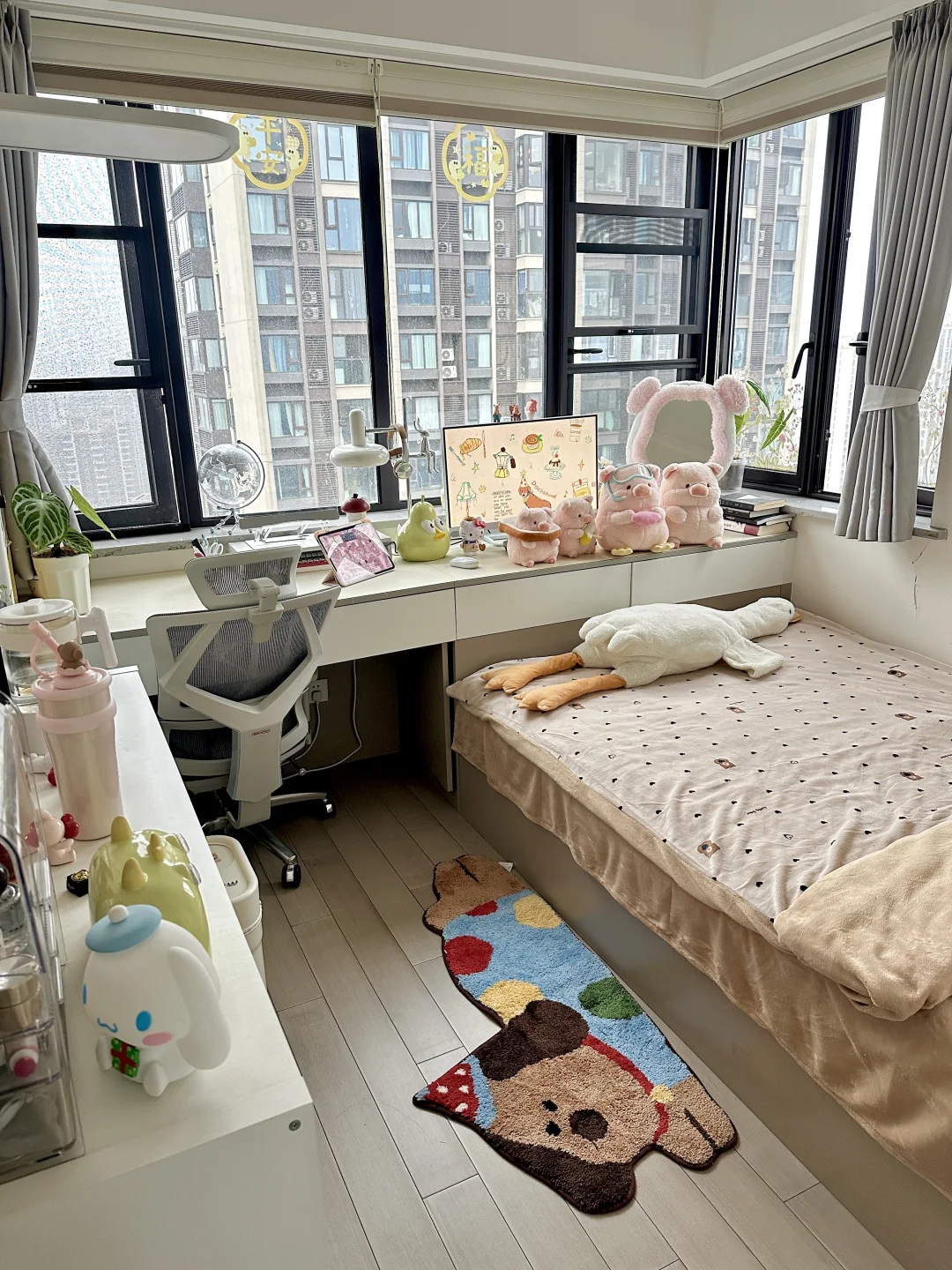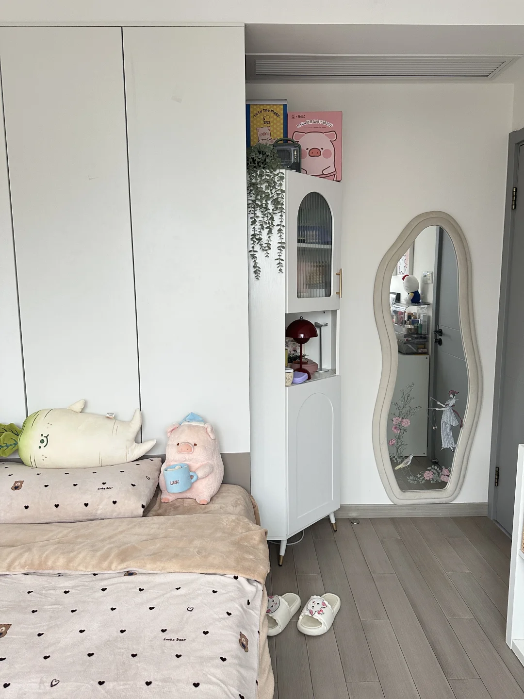 书桌、床和衣柜是全屋定制,正好花了1w左右,软装是这两年慢慢积攒的,从空无所有的小房间到现在满满当当的样子,真的会感受到幸福。还有很多人问门后面的不规则镜子🪞,是在墙上打孔打进膨胀螺丝挂在墙上的,不是粘上去的!!!