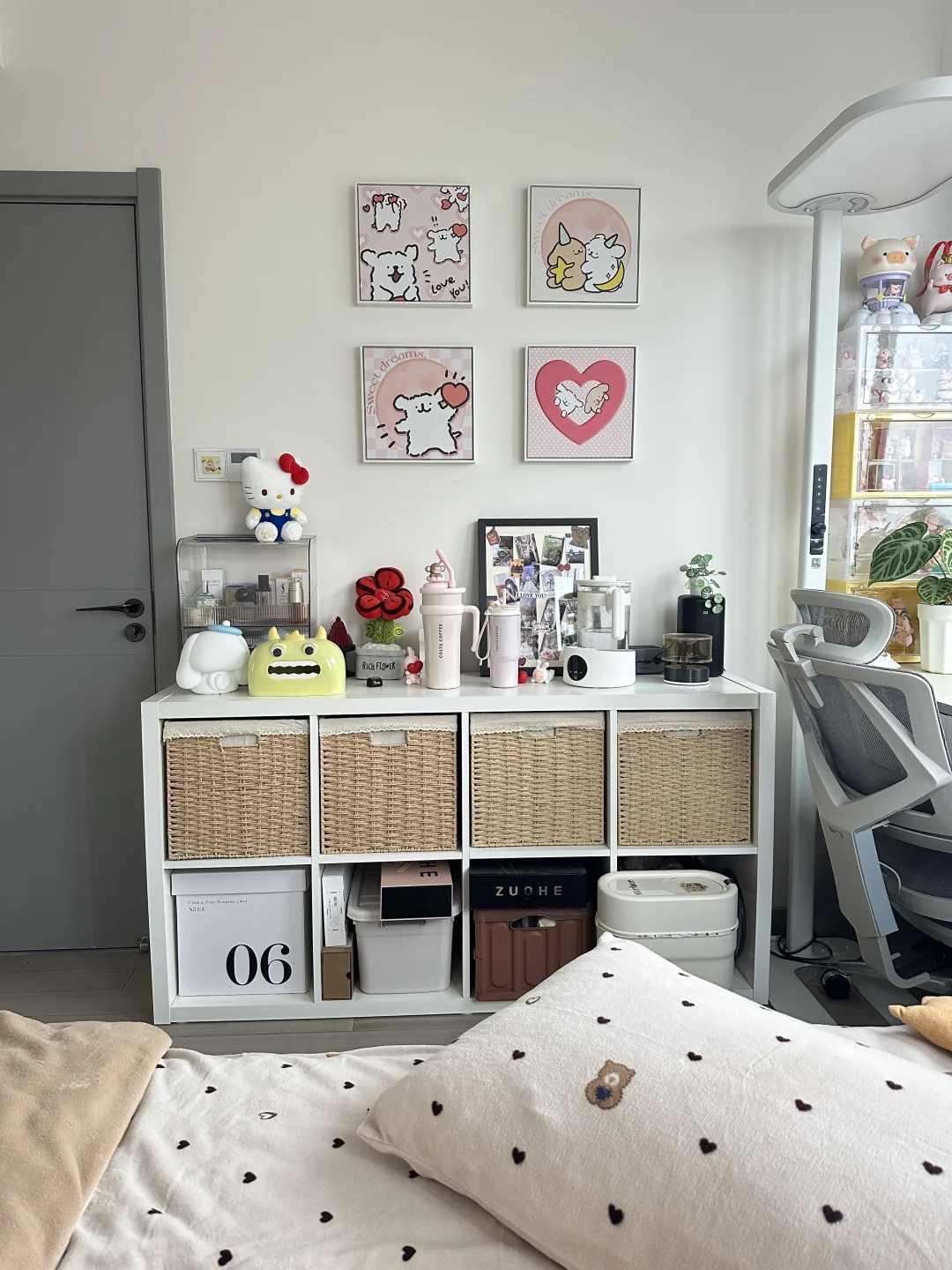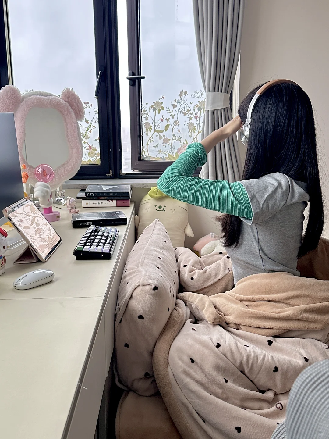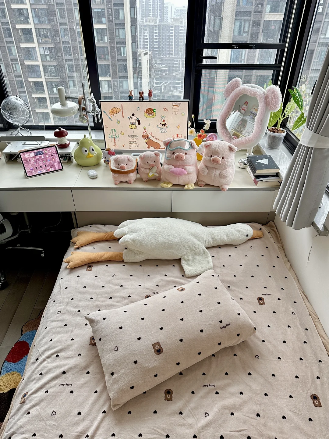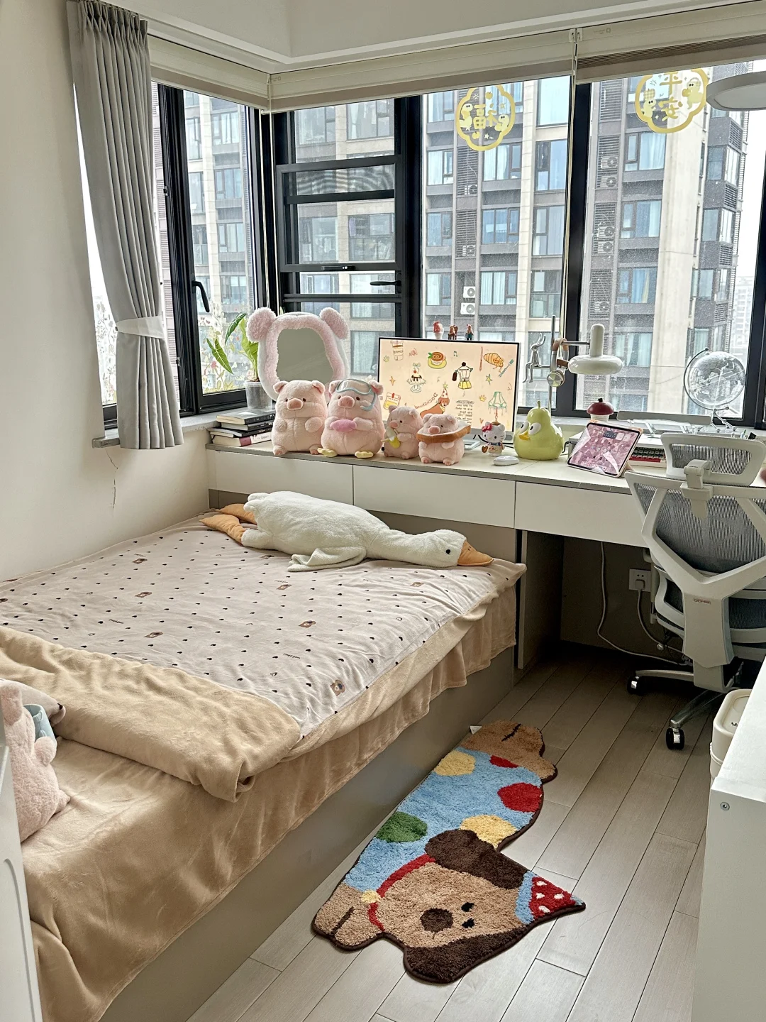 书桌、床和衣柜是全屋定制,正好花了1w左右,软装是这两年慢慢积攒的,从空无所有的小房间到现在满满当当的样子,真的会感受到幸福。还有很多人问门后面的不规则镜子🪞,是在墙上打孔打进膨胀螺丝挂在墙上的,不是粘上去的!!!