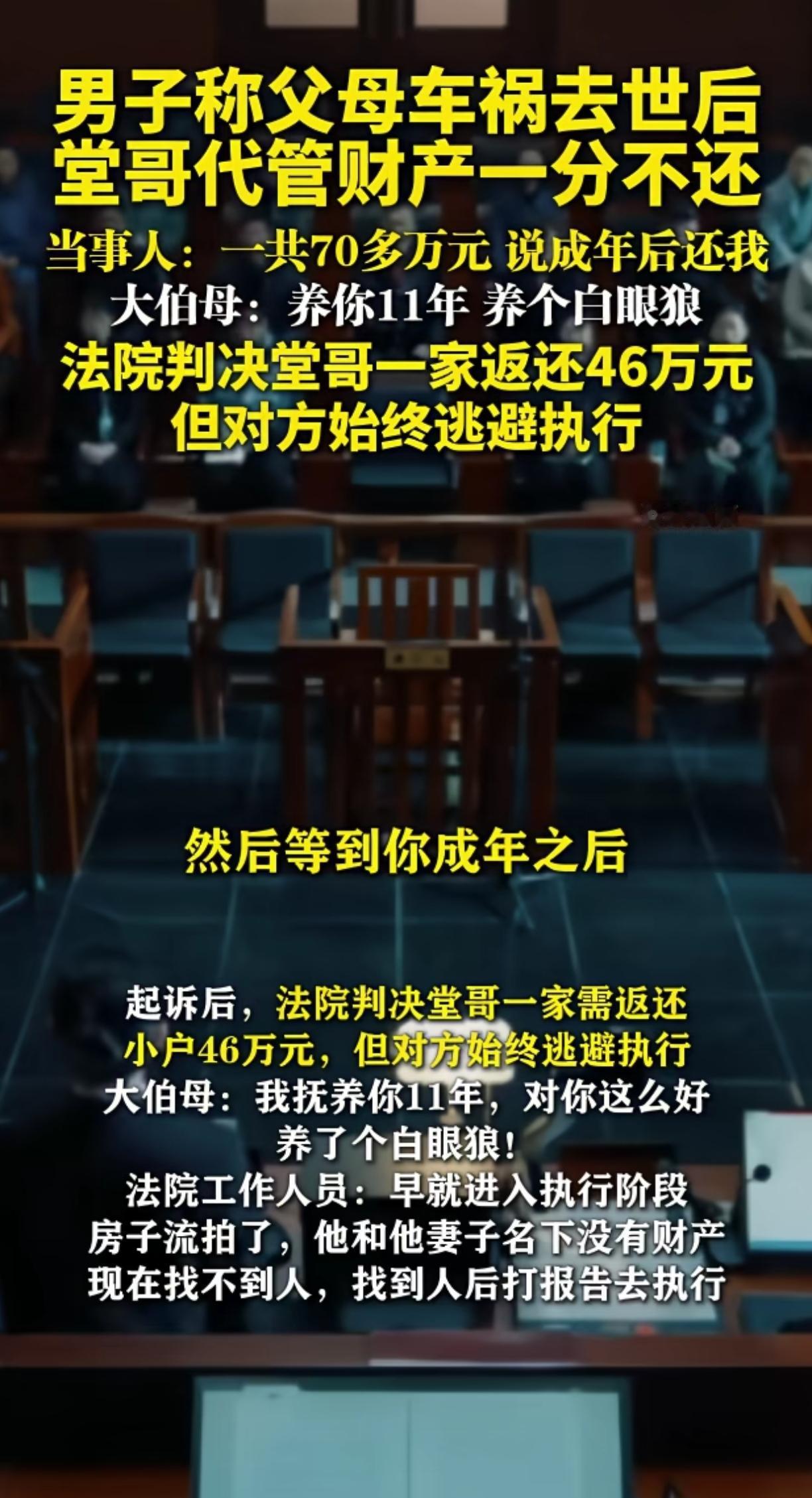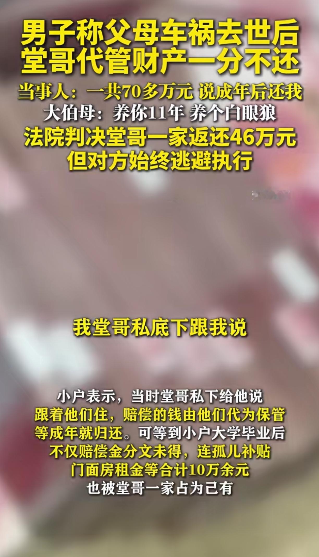 这才是真正的吃绝户啊 10多年前的70万赔偿,堂哥一家以照顾未成年为由头,把钱拿到手里,现在孩子都大学毕业,长大成人,为什么不兑现当年的承诺把钱还给弟弟,反而还骂人家白眼狼,养了11年养不熟! 真不知道这个大伯母这话怎么说的出口,本来就是人家父母和大姐出车祸死亡后的赔偿金,不管怎么说继承人都是他们的亲生儿子,现在大伯母一家把钱吞了,就连人家家门面租金和小孩的孤儿补贴都一股脑拿到了自己的荷包,还知道躲避法院强制执行,把钱财转移,一家人真是高啊! 之前就刷到过这个新闻相关片段,这孩子最后把微信转账和打款记录都拿出来了,大学四年总共才给了2万,他平时要靠勤工俭学打散工才能生存,70万变46万,再怎么养,这11年的生活费都算给他们了,再说当年的70万存银行到现在,大概有20万利息了,人性啊,真难评! 看样子从一开始他堂哥一家不是看他可怜,而是看上的那几十万,堂哥一家真的很敢,比电视剧还会演! 真的没想到世上还有这种黑心良的亲人!