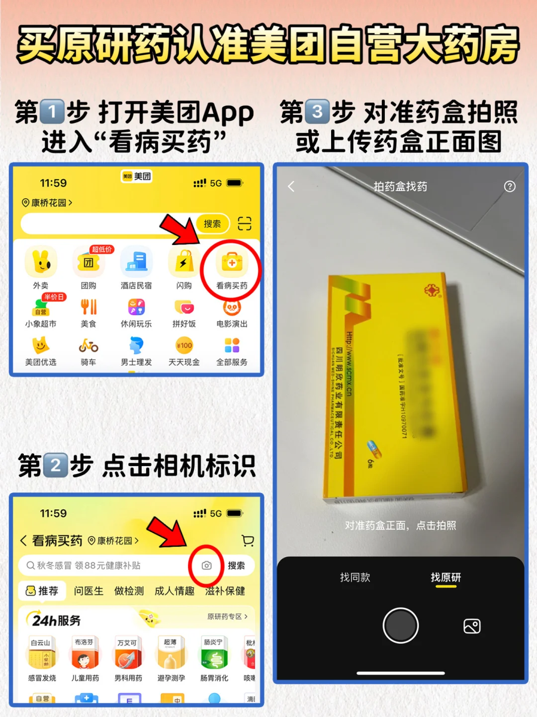 [自拍R]快拿出手机,试试美团买药的“原研药小助手”功能,直接扫描药盒,就能识别到原研药,记得选择“美团自营大药房”标识下单,不仅正品有保障,而且全网低价的价格,不怕比!顺丰空运送达,再也不用担心输错名、认错药啦!方便得很!