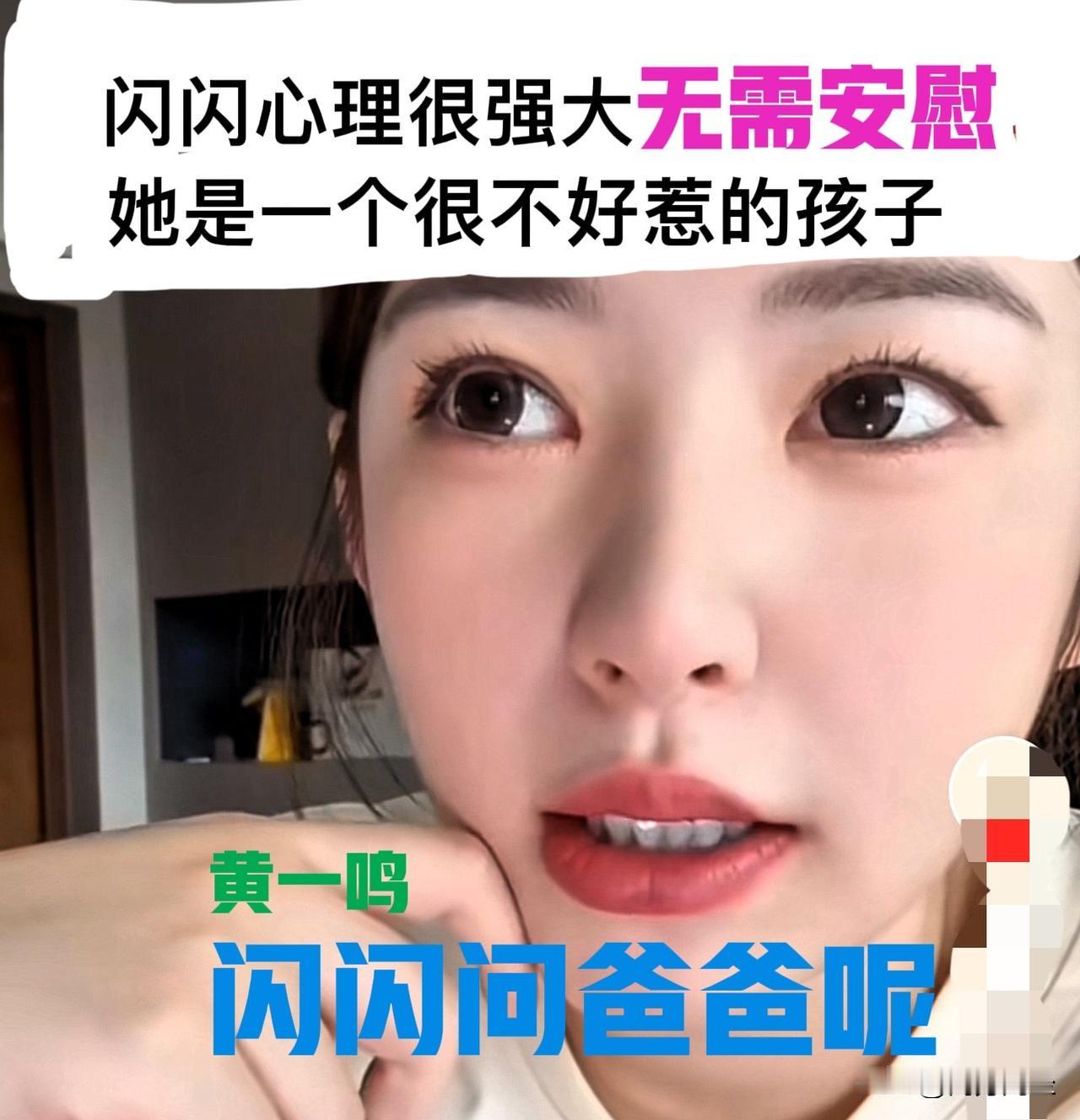 有人担心,假如有一天闪闪问妈妈:“爸爸去哪了”,黄一鸣该怎么回答。 对于这个问题,黄一鸣有自己的考量。 社会上单亲家庭很多,黄一鸣并不认为单亲是一件难为情的事情。 她自己也是单亲家庭长大的孩子。 黄一鸣心想,有些事等闪闪长大了,自然就会明白了,无需刻意的去做什么心理疏导。 目前,闪闪性格活泼开朗,并没有因为父亲角色的缺失,影响到孩子的健康成长。 黄一鸣“妈妈滤镜”上身,口中对女儿闪闪那是赞不绝口。 一、夸女儿聪明,聪明程度令人感到震惊。 二、夸女儿跳舞有天赋,广场舞学的有模有样。 三、夸女儿性格霸道强势,是一个不好惹的孩子。 四、夸女儿心理强大,无需刻意安慰。