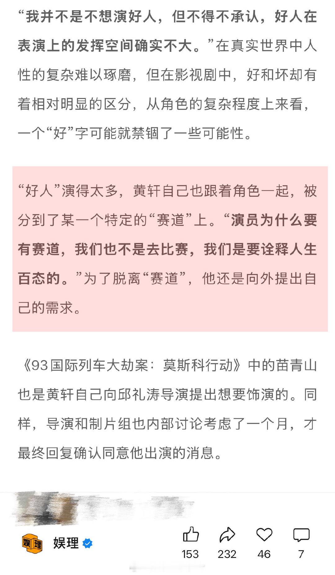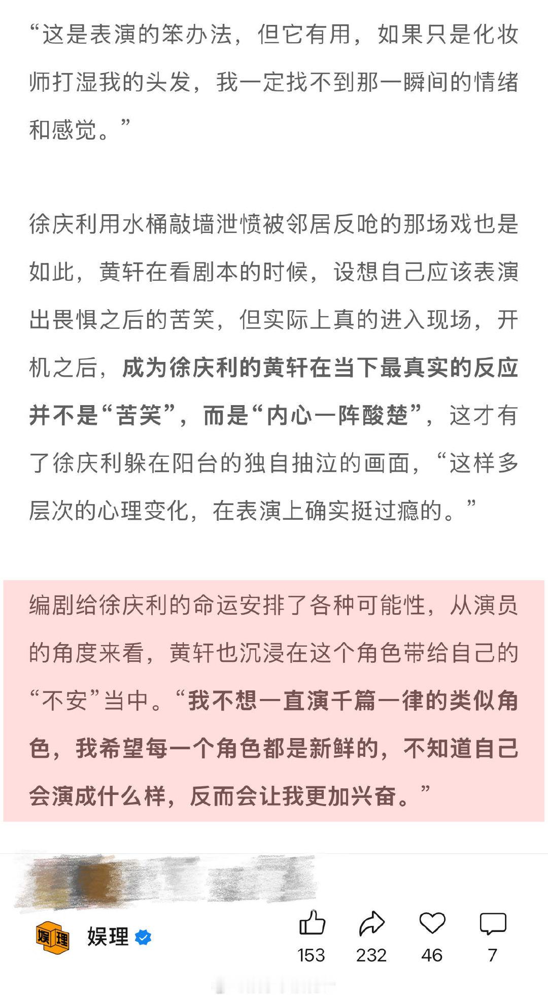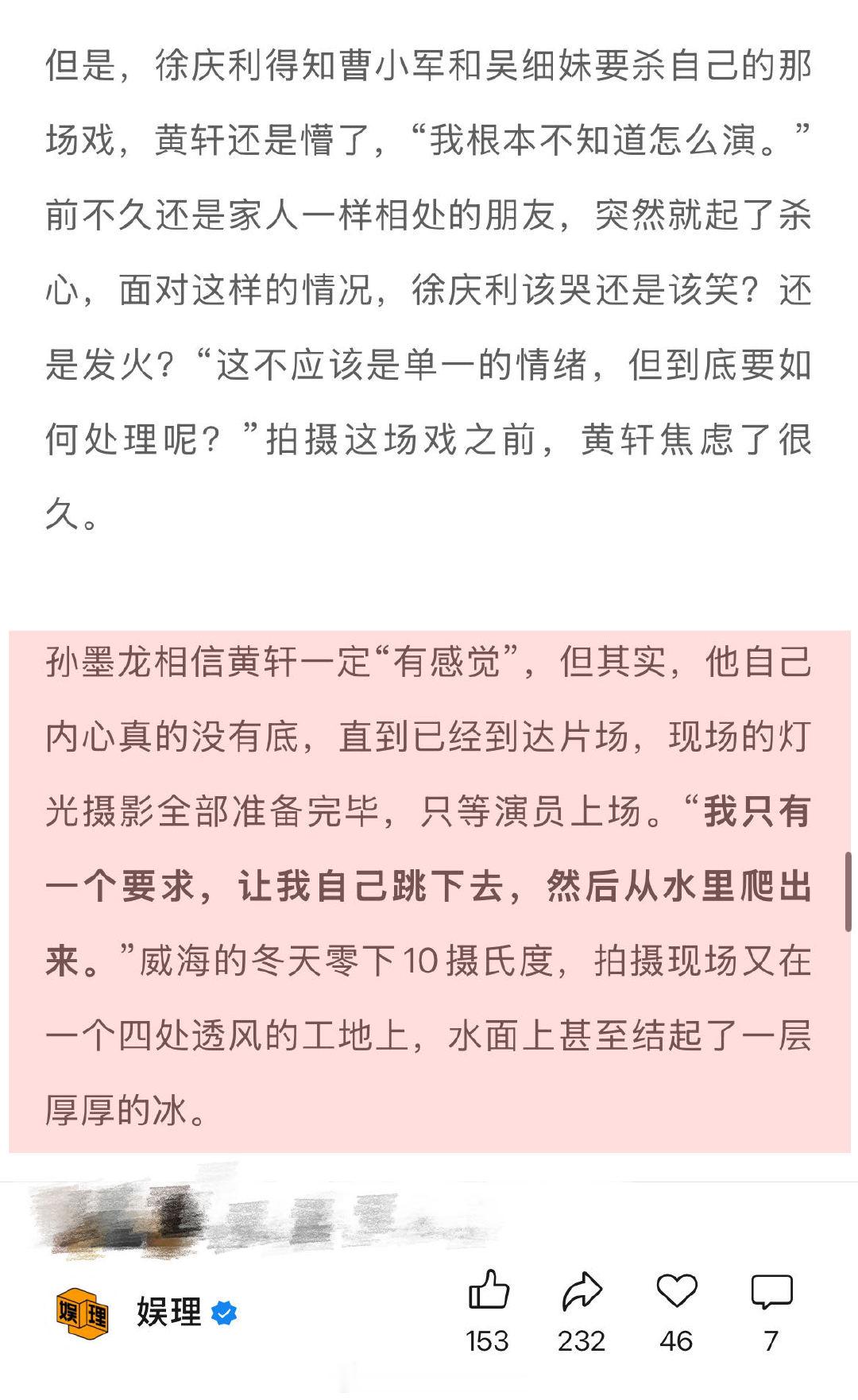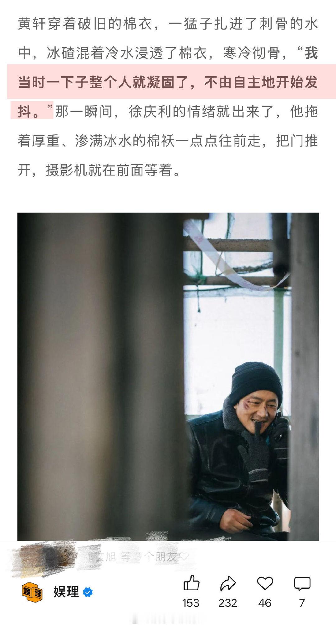 黄轩回应面相变了 黄轩问演员为什么要有赛道 得知曹小军和吴细妹要杀徐庆利的那场戏,焦虑了很久,“我只有一个要求,让我自己跳下去,然后从水里爬出来。”当时威海的冬天零下10摄氏度, 黄轩穿着破旧的棉衣,一猛子扎进了刺骨的水中,“我当时一下子整个人就凝固了,不由自主地开始发抖…”娱理独家↓