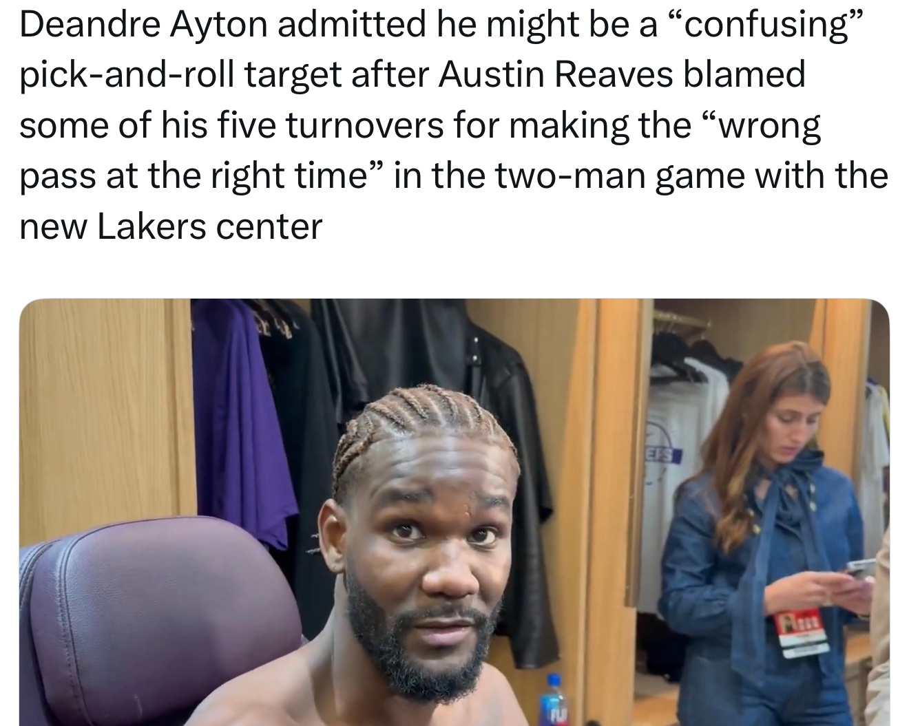 艾顿赛后坦言,自己在挡拆配合中可能确实"令人困惑"。此前里夫斯曾表示,在与艾顿进行二人配合时,里夫斯自己的5次失误中有几次是因为"在正确时机传错了球"。
