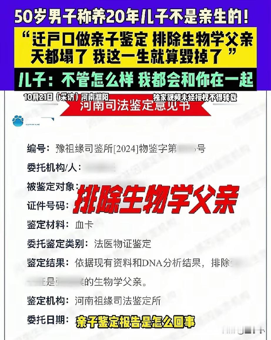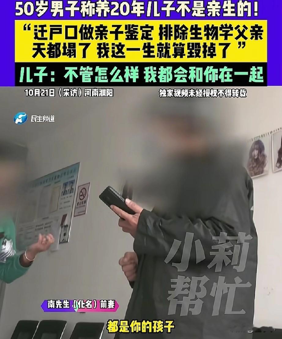 天塌了!河南一位男子给孩子迁户口时,竟然发现自己养了20年的孩子不是自己的,看到这一结果,男子觉得自己这一生都被毁了,然而前妻却一口咬定,就是自己的孩子。 根据媒体的报道,男子在2003年和妻子登记结婚,夫妻育有一儿一女,因为感情破裂,2015年两人离婚,离婚后前妻带着女儿走了,而他带着儿子生活。 转眼20年过去了,当初离婚时,儿子的户口一直都在妈妈的名下,男子就想把儿子的户口迁到自己名下,但是需要亲子鉴定来证明父子关系。 当亲子鉴定结果出来后,男子傻眼了,养了20年的儿子竟不是自己亲生的,男子崩溃了,感觉天都塌了下来,自己这一辈子彻底毁了。 面对男子的质问,前妻还是口口声声说,孩子就是自己的,亲子报告也许会是假的,不过好在经过调解后,双方也同意在做一次亲子鉴定来确认孩子到底是不是自己的。 不过这儿子也没有白养,不管结果是什么,他自己也表示,会一直和父亲在一起。 希望真的弄错了!