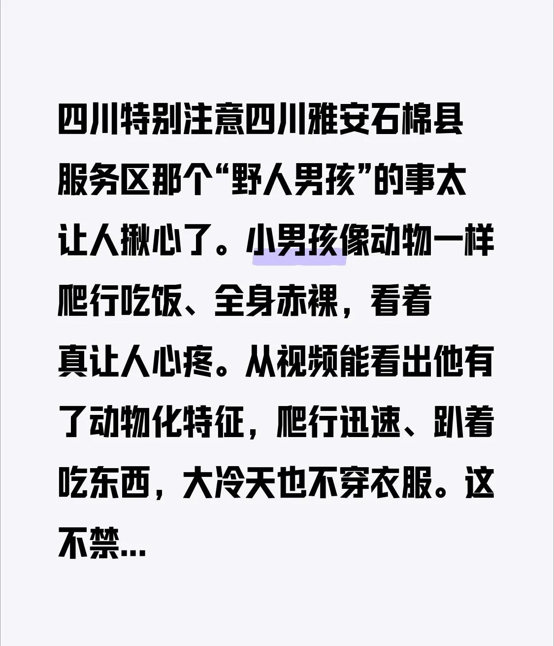 四川特别注意 四川雅安石棉县服务区那个“野人男孩”的事太让人揪心了。小男孩像动物一样爬行吃饭、全身赤裸,看着真让人心疼。从视频能看出他有了动物化特征,爬行迅速、趴着吃东西,大冷天也不穿衣服。 这不禁让人想起印度“狼孩”,他们也有类似动物化表现。这个3岁左右(看着像4岁)的男孩,因长期营养不良身材瘦小,还错过语言发育期,不与人沟通、不会说话。 现在虽然有工作人员介入,父亲也承诺带孩子落户,但他回归正常社会太难了。那些不良习惯要改,上学也会面临诸多问题,老师沟通、同学接纳都是挑战。真希望他能早日恢复正常生活。