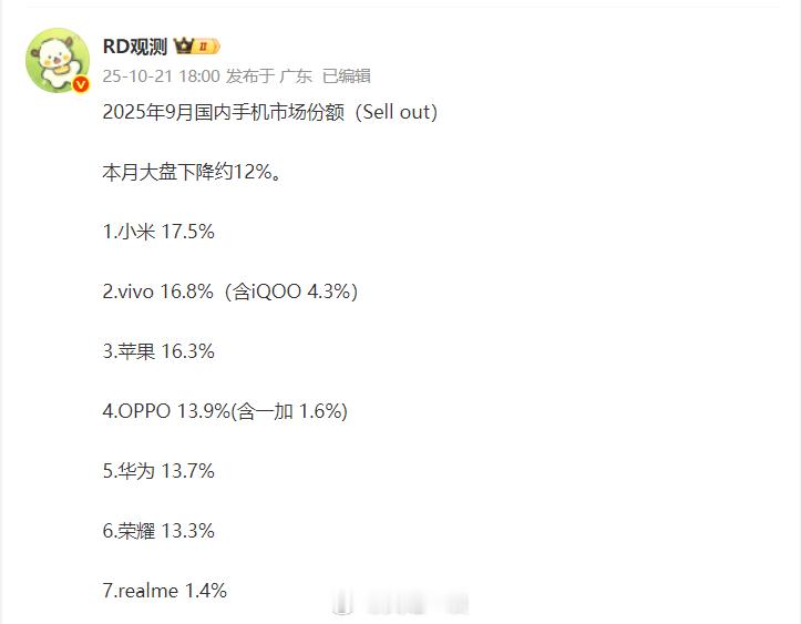 PS:这三个品牌之外的品牌都是处于新机发布前的低谷期,十月份排名将更加激烈。曝iPhoneAir暂停生产