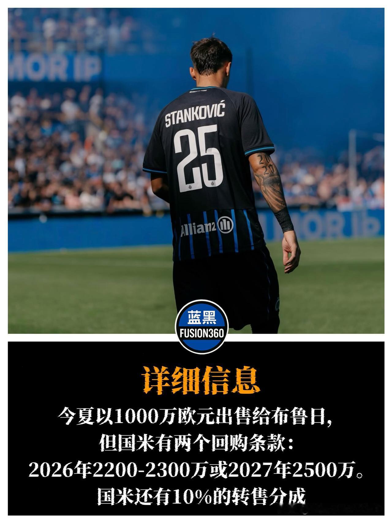 国米设双重回购!斯坦科维奇能否重返梅阿查 今夏国米以1000万欧元将德扬之子亚历山大·斯坦科维奇出售给布鲁日,但在合同中精心设计了回购条款:2026年可用2200万欧元买回,2027年则需支付2500万欧元。这一安排显示蓝黑军团对这位2005年出生中场的未来仍抱有期待。 斯坦科维奇本赛季已为布鲁日出场15次并打进1球,表现可圈可点 。据意大利媒体透露,国米的策略是让他在布鲁日成长至少两个赛季,如果持续进步,将在2027年夏天激活回购条款 。届时布鲁日将获得1500万欧元的可观利润,而国米则收获一位完全成熟的中场核心。 此外国米还保留了未来转售10%的分成权 ,这意味着无论斯坦科维奇去向何方,蓝黑军团都不会空手而归。从青训营走出的传奇之子,能否最终重披国米战袍? 你认为斯坦科维奇有潜力成为国米未来中场支柱吗?国际米兰 💙🖤