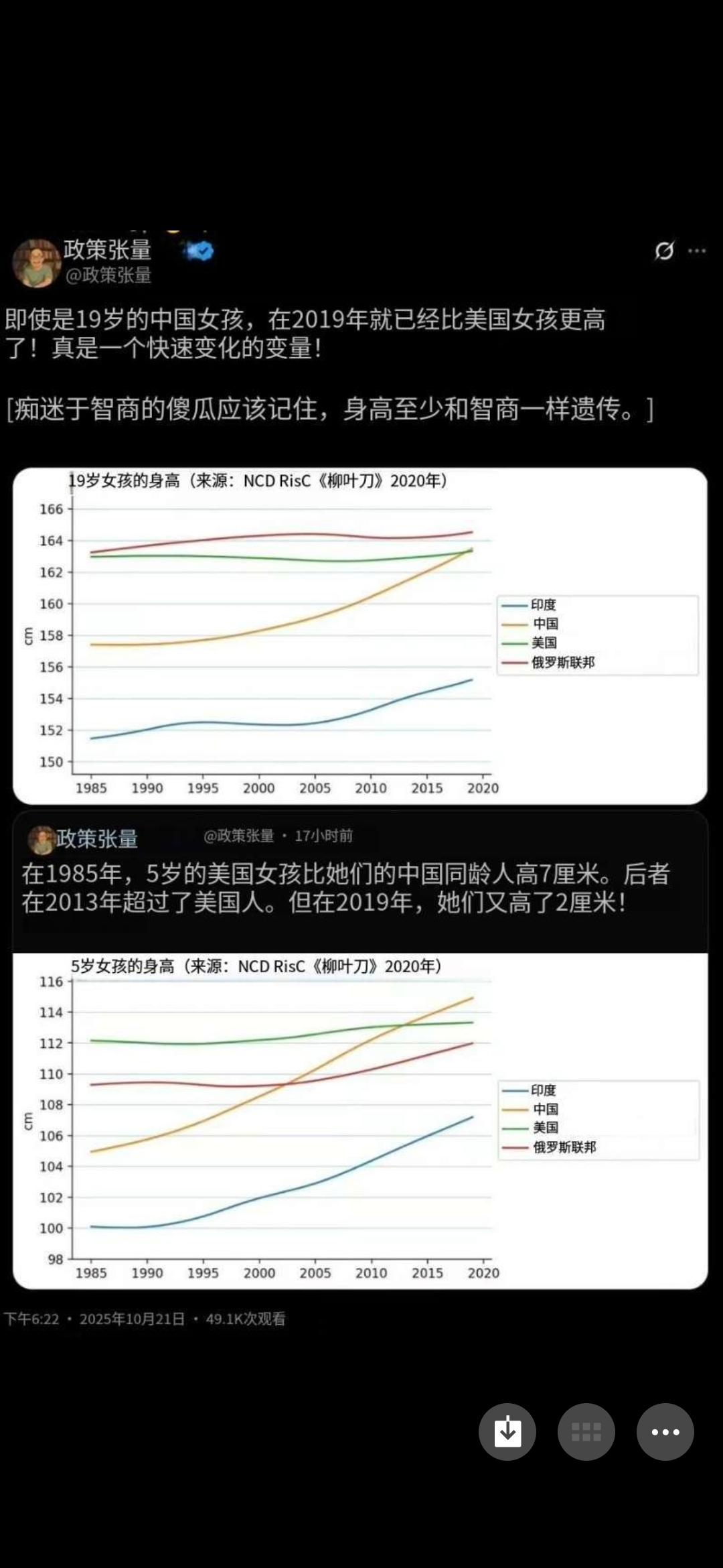 最近一个美国博主发的帖子在外网火了,这个帖子的内容是对世界各国女性身高的统计,这个美国博主震惊地发现在2019年,中国19岁女孩的身高就已经超过了美国的同年龄女孩;在2013年,中国5岁女孩的身高也超过了美国人,2019年,中国5岁女孩更是比美国5岁女孩高出足足2厘米。 这个结果令人震撼,在一般印象中,都是发达国家国民的身高要超过发展中国家的,毕竟发达国家的国民从小到大就吃得好穿得好睡得好,营养充足,这样一来自然就发育完美,更加高大、健康。但现在这个统计数据打破了这个固有认知,我们这里年轻女孩的身高,竟然已经超过了美国人! 因此,这个帖子一下子火了,谁也没有想到,在身高方面,美国竟然远远落后了中国! 曾几何时,始终有一种观点,说我们之所以比欧美人要矮,是因为身体基因不行,欧美人种就是会长得更加高大健壮;可现在看来,完全不是这么回事,只要营养跟上了,我们可要比欧美人种高多了,至少比美国人要更加高大健壮!