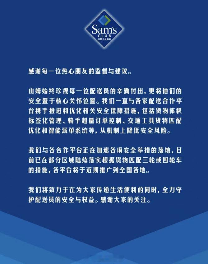 【山姆配送员安全保障声明】10月22日,山姆将改用三轮车运输大件货物登上热搜引发热议。10月21日晚,山姆会员商店在其官号评论区发声明:山姆始终珍视每一位配送员的辛勤付出,更将他们的安全置于核心关怀位置。我们一直与各家配送合作平台携手推进和优化相关安全保障措施,包括货物体积标签化管理、骑手超量订单控制、交通工具货物匹配优化和智能派单系统等,从机制上降低安全风险。